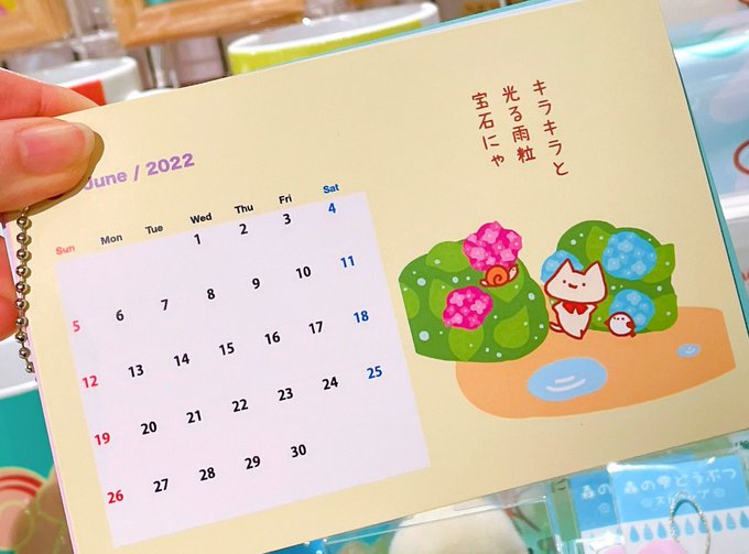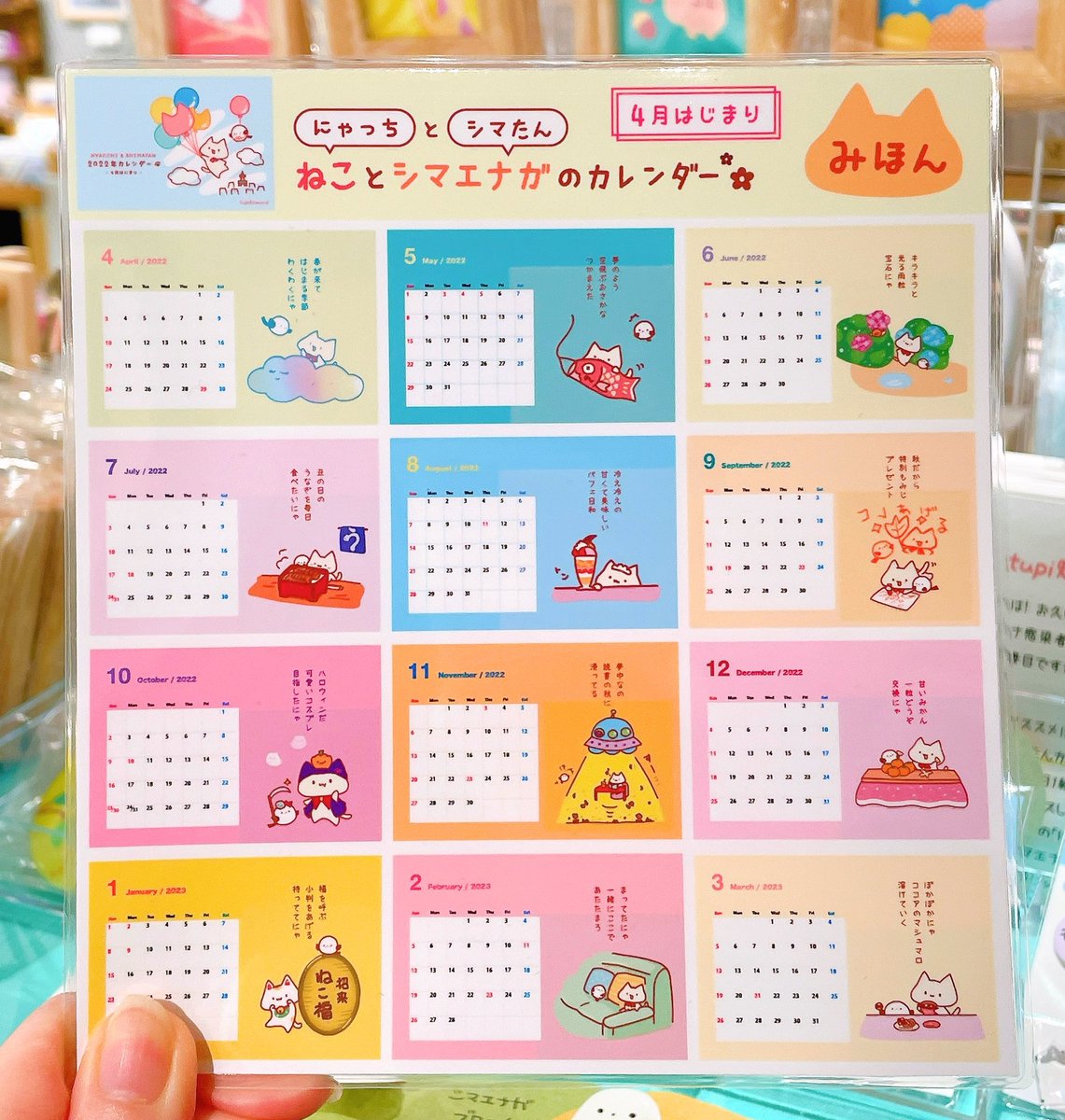#カレンダー は4月始まりです!学校や会社で新年度な方に特にオススメ✨ 見本置いてあるので自由に見てみてくださいねー❣️ 自作の川柳(らしきもの)が添えてある #猫 と #シマエナガの 癒しカレンダーです🍀 #ゆるいイラスト #サッポロファクトリー #アートコーナー #イラスト好きさんと繋がりたい