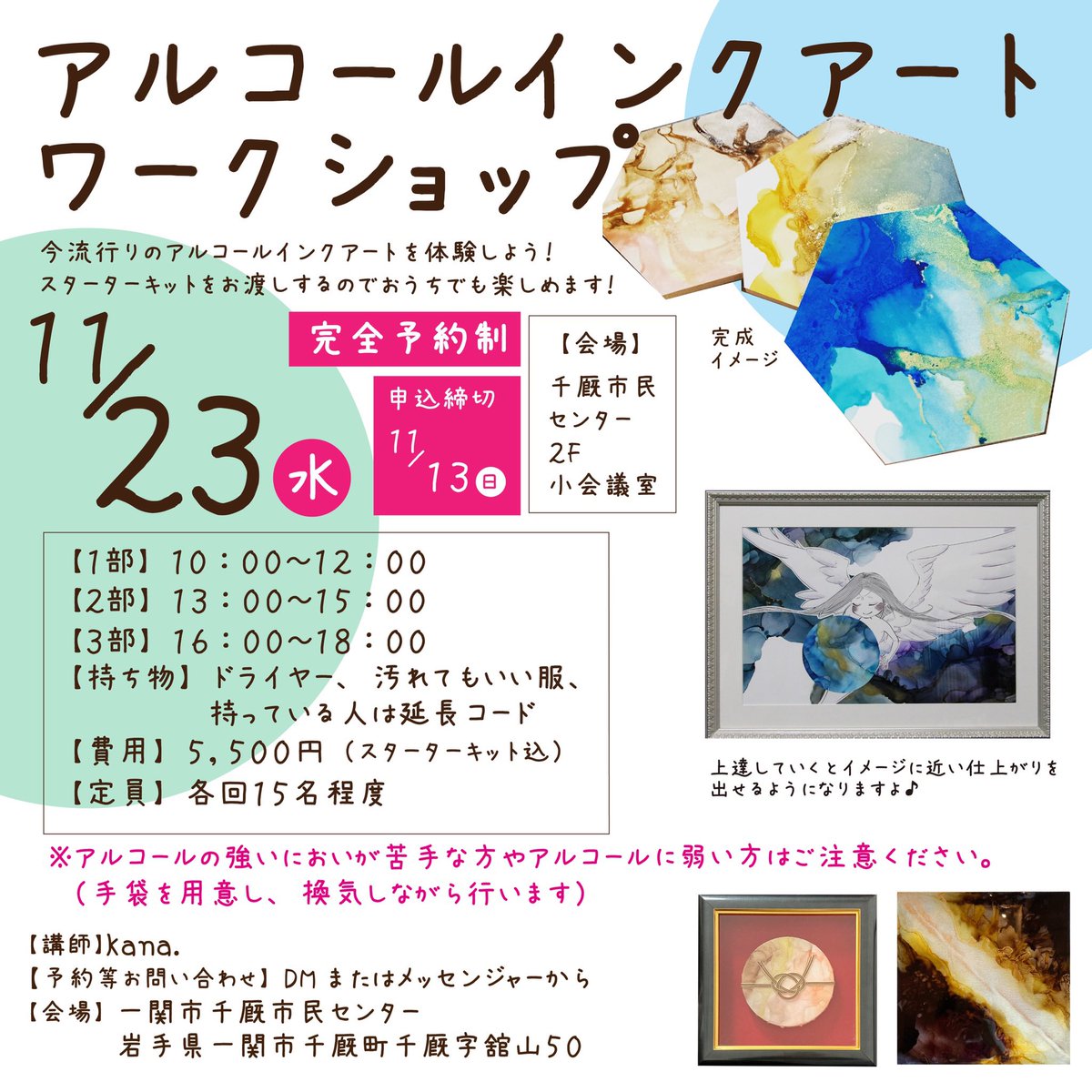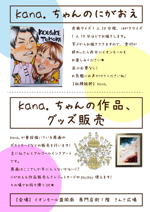 ◼️お知らせ◼️ イオンモール盛岡南店にて似顔絵と作品販売を行います。 助手は母ちゃんです。 是非遊びに来てくださいね〜 #イオンモール盛岡南 #さんさ広場 #似顔絵 #ほとけ絵 #アルコールインクアート #作品販売