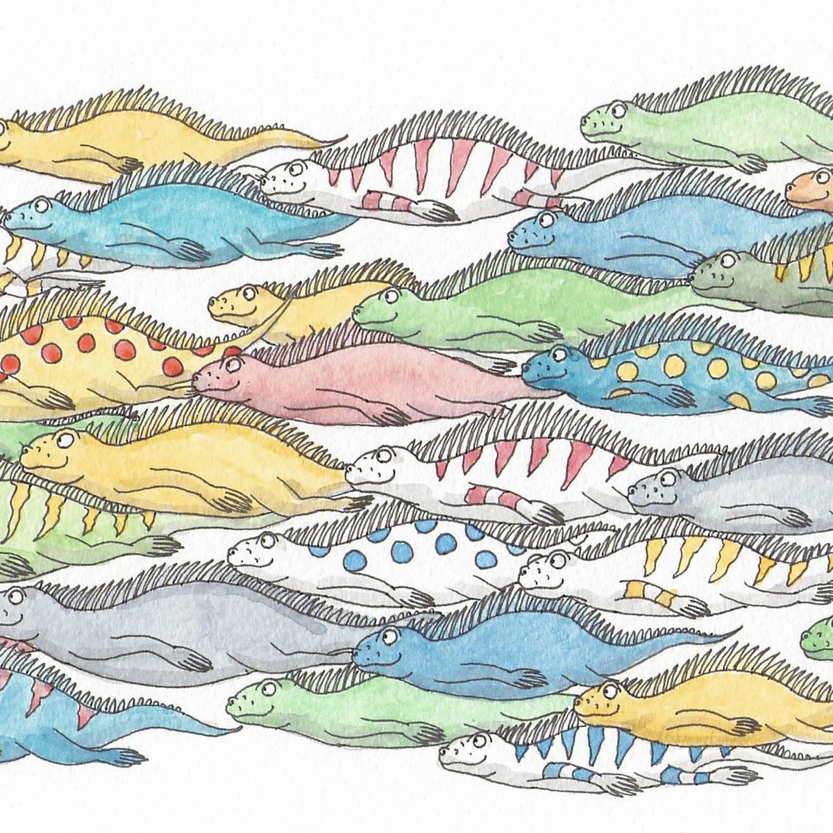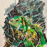 ワカメイグアナです。 ワカメの森に逃げ込んだ小魚を追ってきた大きい魚を捕まえる。 予想外のサイズが来てしまった時はしっかり擬態する。 #イラスト好きな人と繋がりたい #絵描きさんと繋がりたい #オリキャラ #ワカメ #イグアナ #擬態 #魚