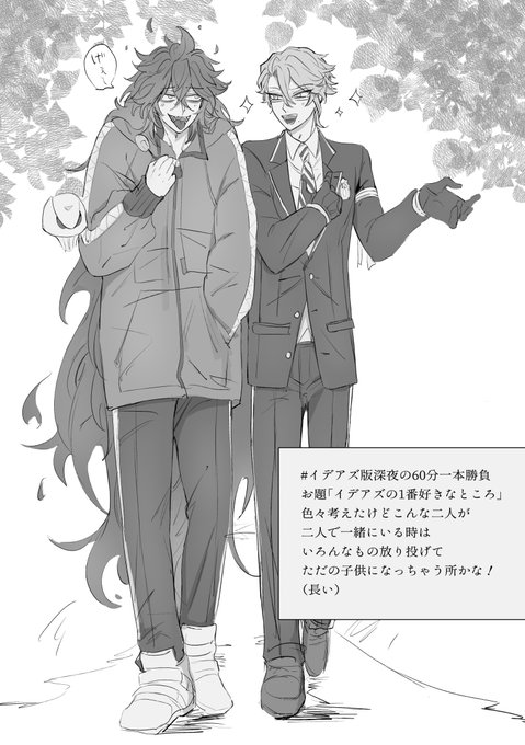 #イデアズ版深夜の60分一本勝負 お題「イデアズの一番好きなところ」 ワンドロ100回おめでとうございます! お互い相手のことを自分より変な奴だなって思いつつ格好悪いところも全部込みで認め合ってるとこが好きです😇こじらせおもしろカプ😇イデアズに幸あれ🫶
