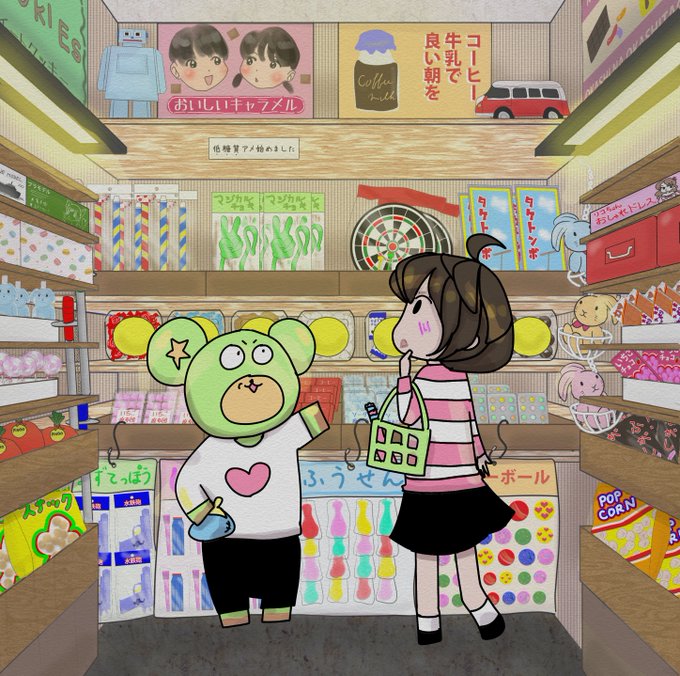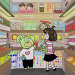 りくちゃん「すてきなおみせ💗」 やまとくん「まーね!好きなだけ買ってやるぜ✨」 #イラスト好きな人とつながりたい #イラスト #イラストの練習 よっしーさんの描いた背景を使いました✨。 ありがとうございました☺️