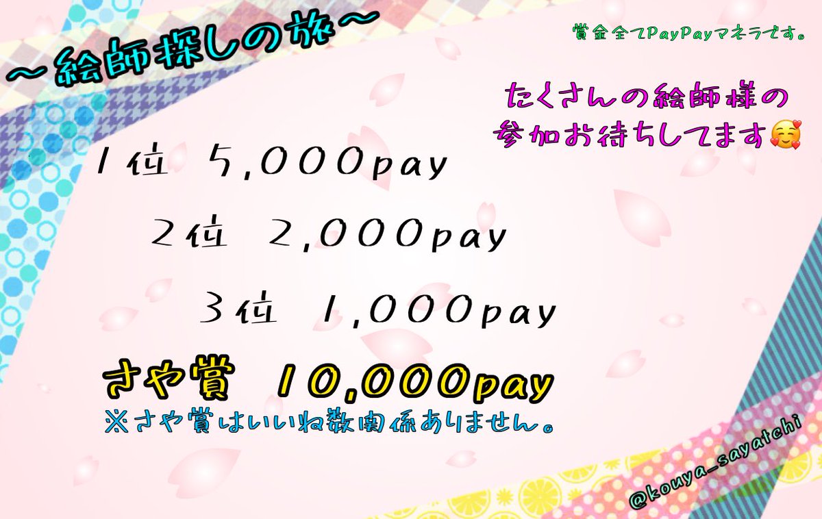 ˗ˏˋ 🎨 絵師探しの旅 🎨 ˎˊ˗ 🥇𝟻,𝟶𝟶𝟶 🥈𝟸,𝟶𝟶𝟶 🥉𝟷,𝟶𝟶𝟶 さや賞 👑𝟷𝟶,𝟶𝟶𝟶 おすすめの絵師さんをメンションして下さい 絵師さん良ければ是非参加してください❤ いいね数 《対価なし》 〆切 4月30日23時59分 #イラストコンテスト #イラスト好きと繋がりたい