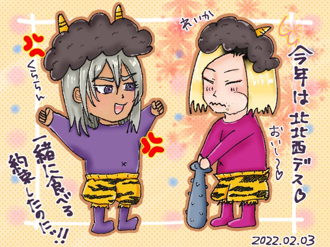 過去絵を今年バージョンに❤️ 恵方巻楽しみ☆ お腹空いてきた〜😚 #節分 #オリキャラ #イラスト #イラスト好きな人と繫がりたい #絵描きさんと繋がりたい #みんなで楽しむTwitter展覧会 #アトリエの系譜