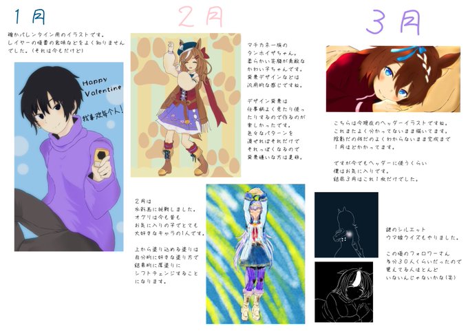 このイラストアカ始めて1年たったらしいのでポートフォリオ作成しました まずは1〜3月と4〜6月、ポートフォリオ自体は計4枚の予定。 横向きでちょうどいいですな 残り2枚は明日投稿します #イラスト好きな方と繋がりたい #絵描きさんと繋がりたい #イラスト練習中 #ウマ娘