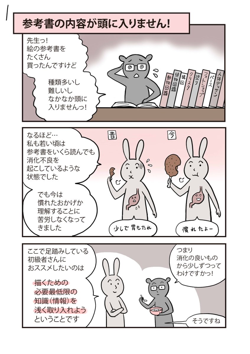 📕「参考書の内容が頭に入りません!」 今回も初心者さん向けの話です😳 昔に比べて情報が豊富になりましたが、 膨大な情報の中で脳のキャパが追いつけてない 若い子も少なくないなと感じることもよくあります #イラスト講師の作画指導帳 #漫画が読めるハッシュタグ #マンガが読めるハッシュタグ twitter.com/nukopin/status…