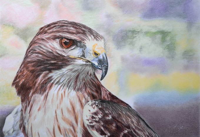 色鉛筆で描いた「タカ」✨ 昨年描いた一枚..φ(・ω・*)カキカキ 「イロドリアルの超リアルな色鉛筆画 P.98〜P.106 中級編④タカを描く」を参考にして描きました✨😄 #色鉛筆画 #色鉛筆 #タカ #イロドリアルの超リアルな色鉛筆画 #colorpencil #colorpencildrawing
