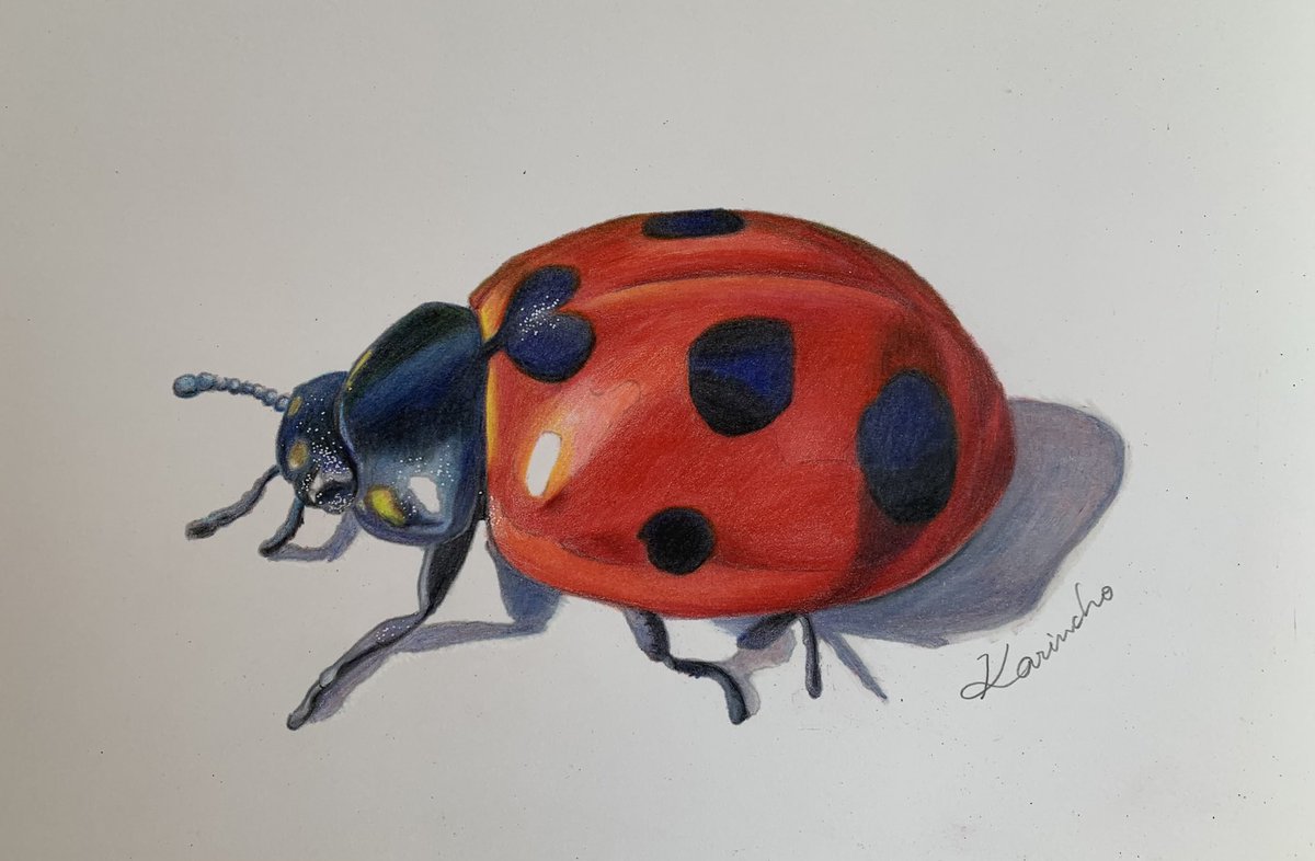 今日の配信を見てからリヒトさんのテントウムシを塗りました✨雑です。しかし完成🙌これをおしゃべりしながら1時間で仕上げる皆さん変態ですね😏 展示会残念ながら拝見できませんが、来週音海はる展行ってきまーす💖 #イロドリアル配信 #色鉛筆画上達ドリル動物編