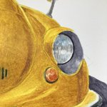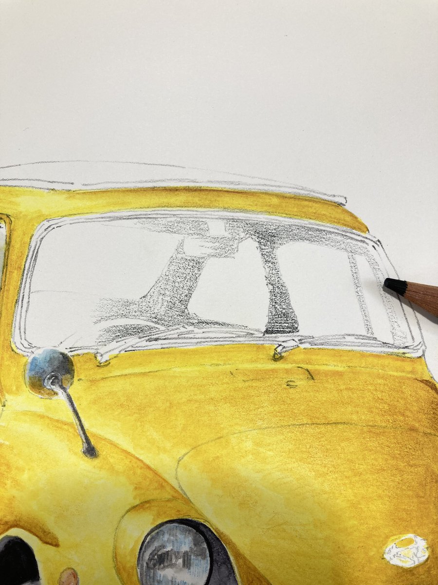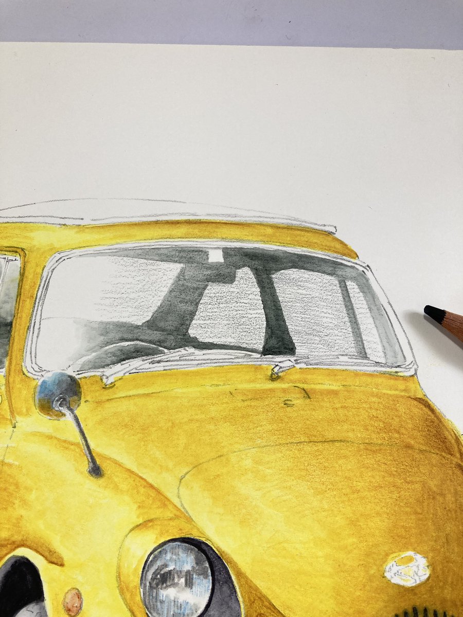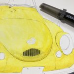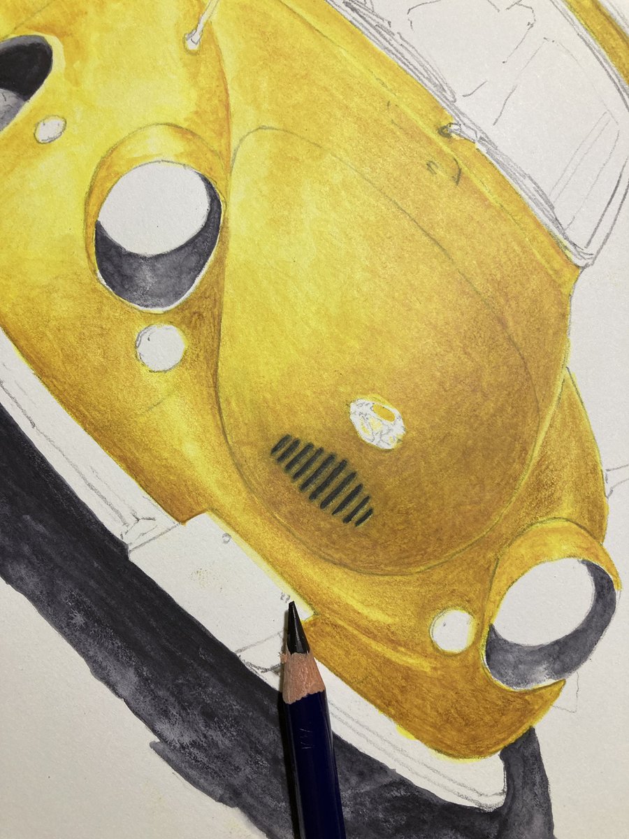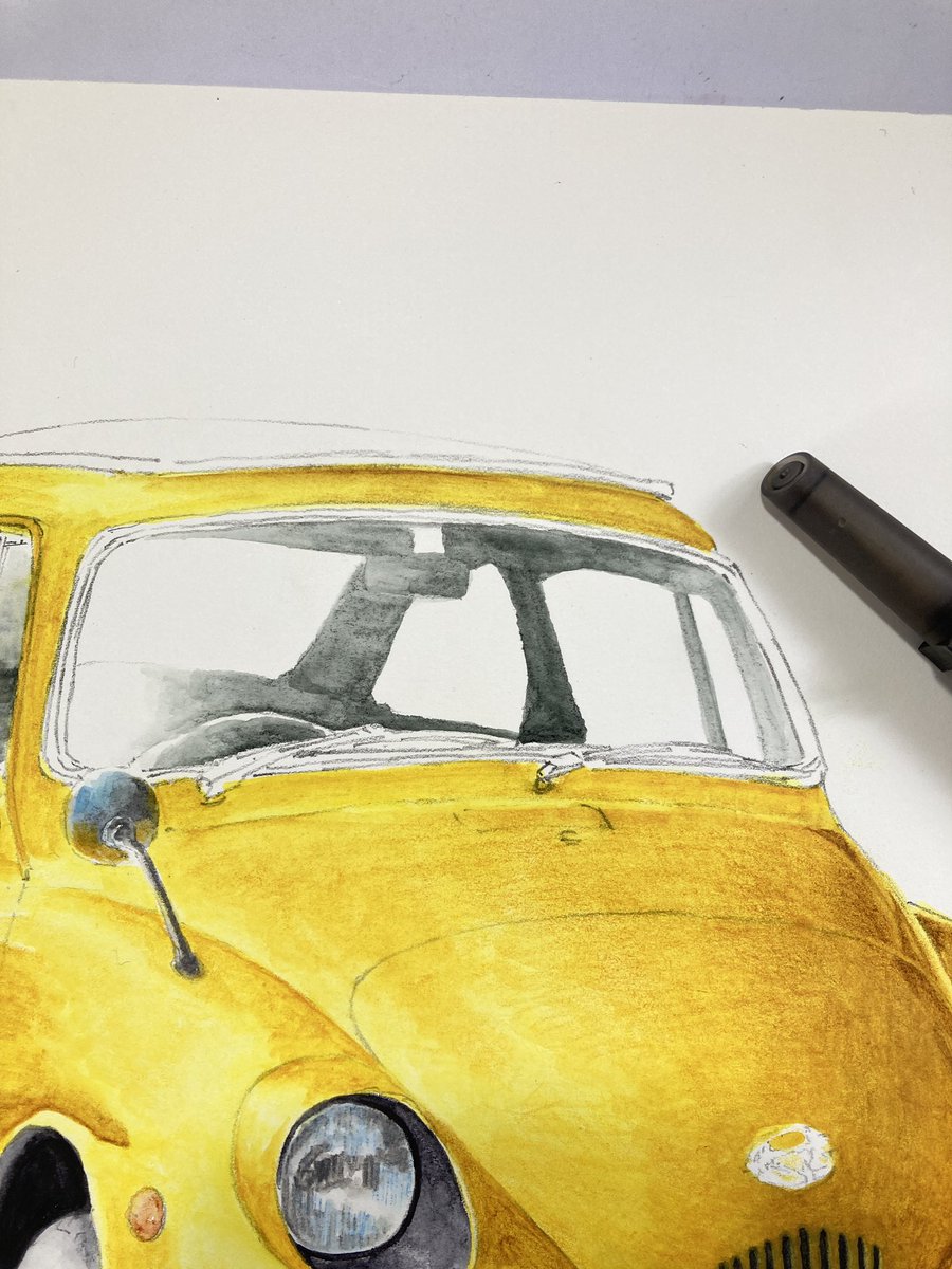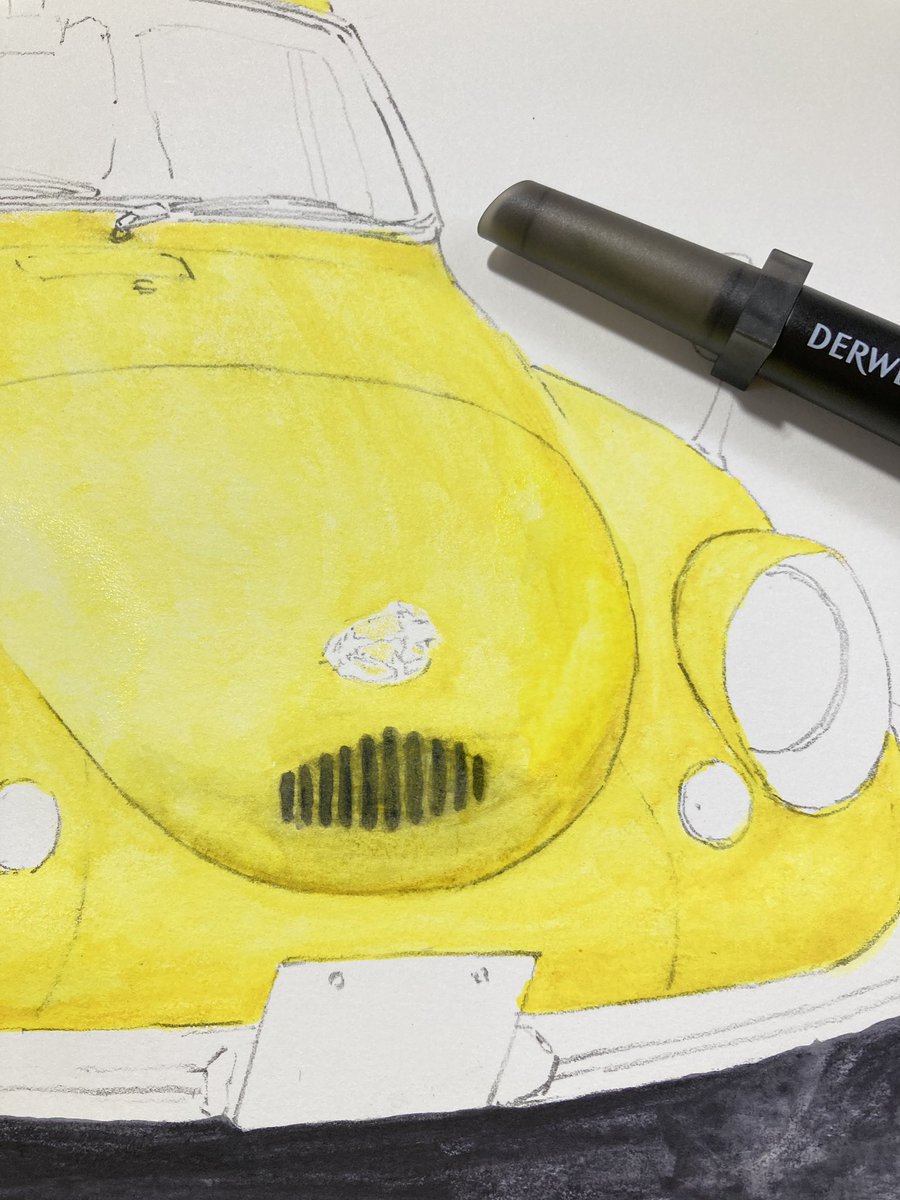 cadmium yellow0210でボディ塗り 先に塗った縦グリルの黒が滲んでしまった😅完全に溶かしきって乾燥させないとさすがに耐水性が発揮されないか。ふむふむ勉強! まだまだ塗り重ねるので濁ったくらい問題無し。 #インクテンス100色缶発売 #イラスト