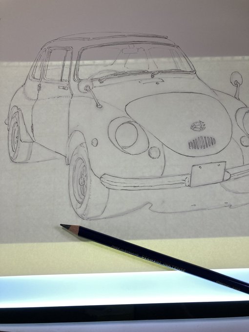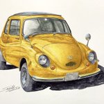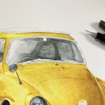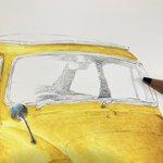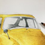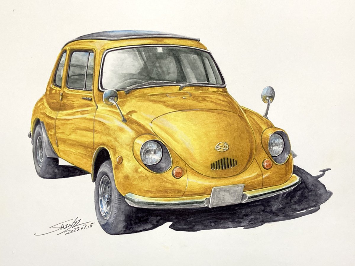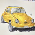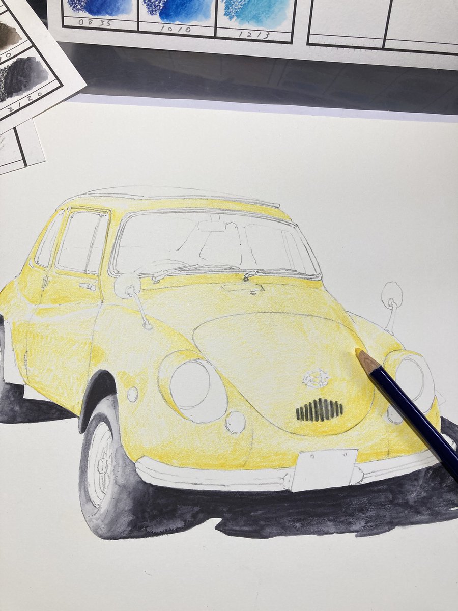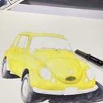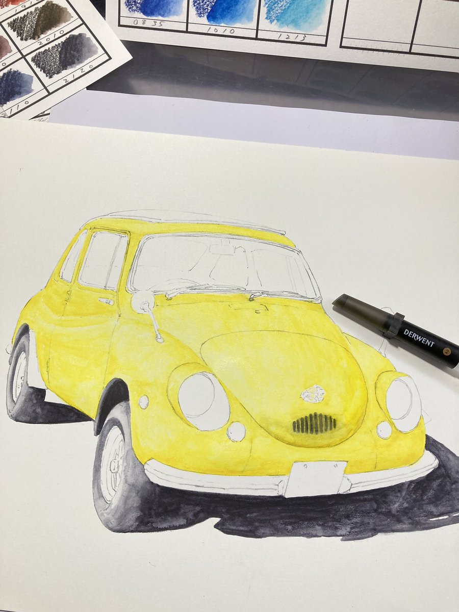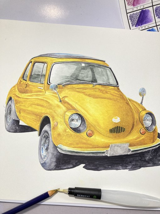 古い軽自動車 完成! 車をインクテンスで全て描くのが実は初めてで、溶かした後の色味や耐水性の事で塗る順序立てなど、油性色鉛筆とは違う考え方をしたので戸惑いもありましたが楽しめました。 発色の良さを感じてもらいたくて黄色にしてみましたが如何だったでしょうか🚖 #インクテンス100色缶発売