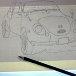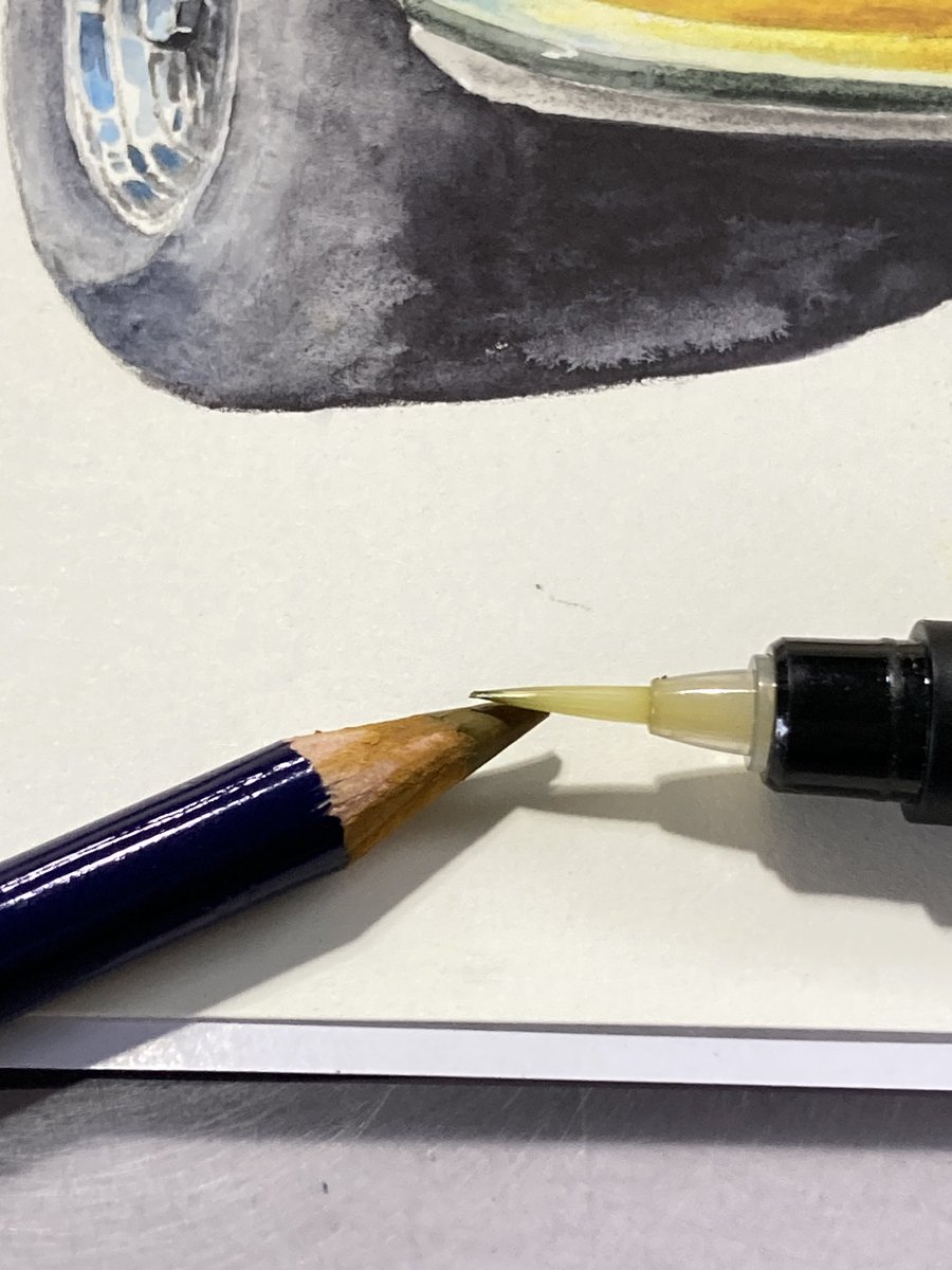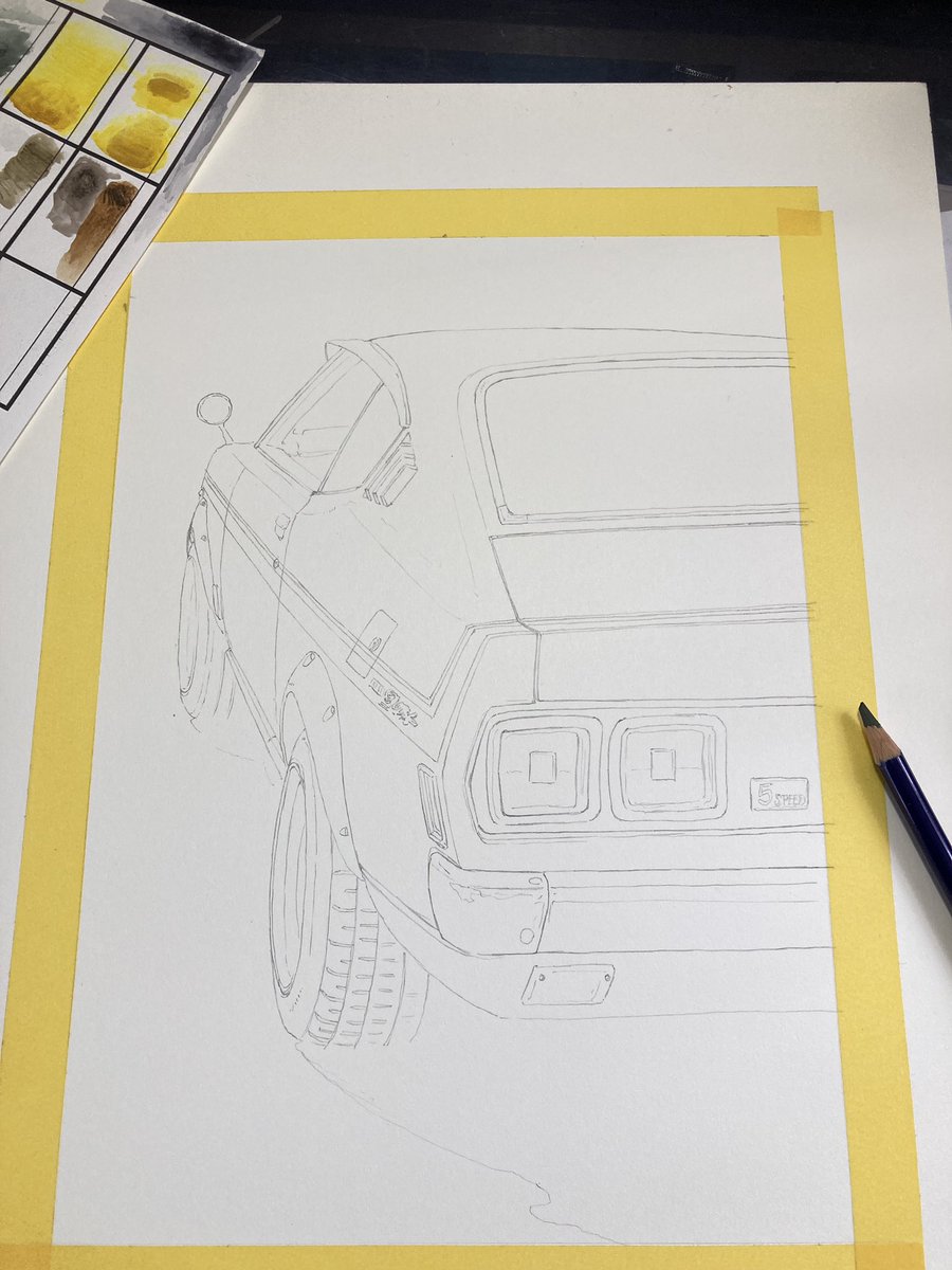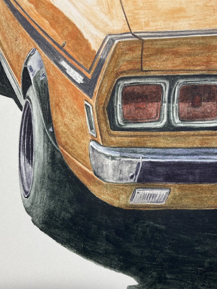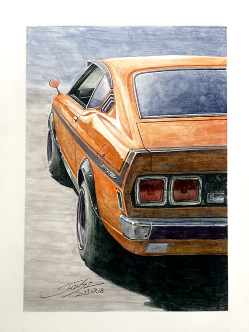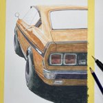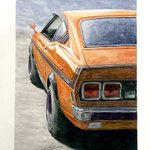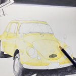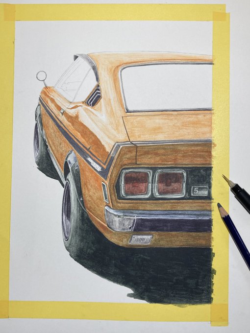 オレンジ色の車…インクテンスで塗ってました 序盤からアレ?失敗したかなぁと焦り撮影も忘れてましたが何とか挽回して今に至る 紙はマルマン@maruman_sketch のヴィフアール水彩紙細目 まだリア周りの暗さが足りないです… #インクテンス100色缶発売 #イラスト