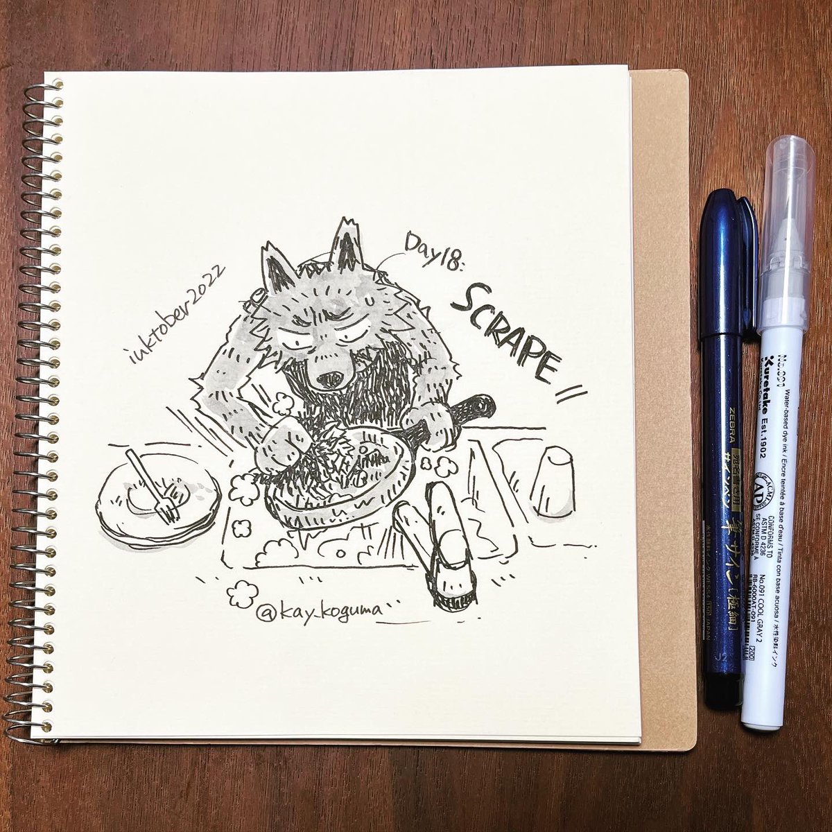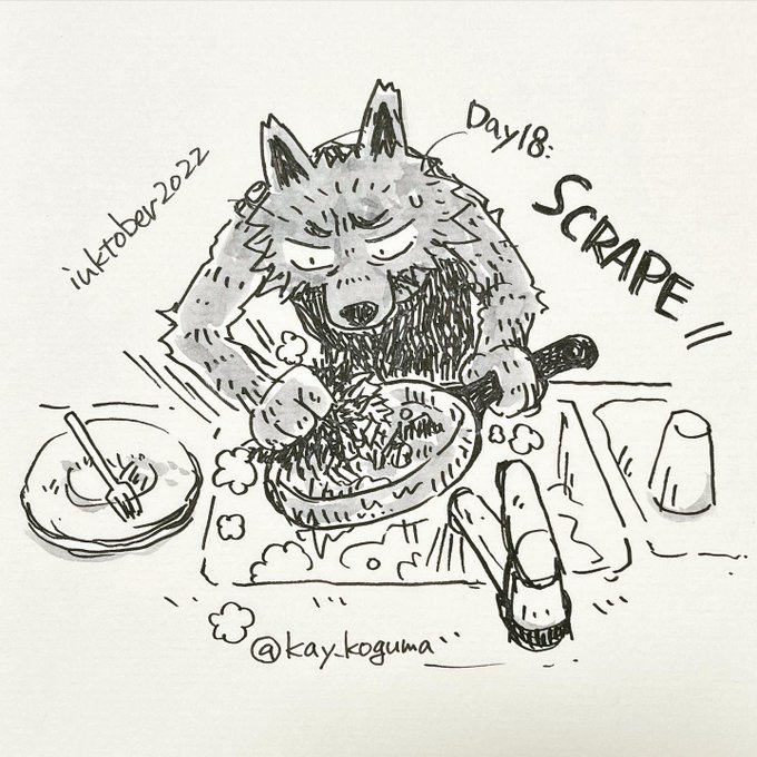 #インクトーバー Day18: こすり落とす/ SCRAPE (昨日の続き)肉はうまかったがフライパンを焦がす。 #inktober #inktober2022 #インクトーバー2022