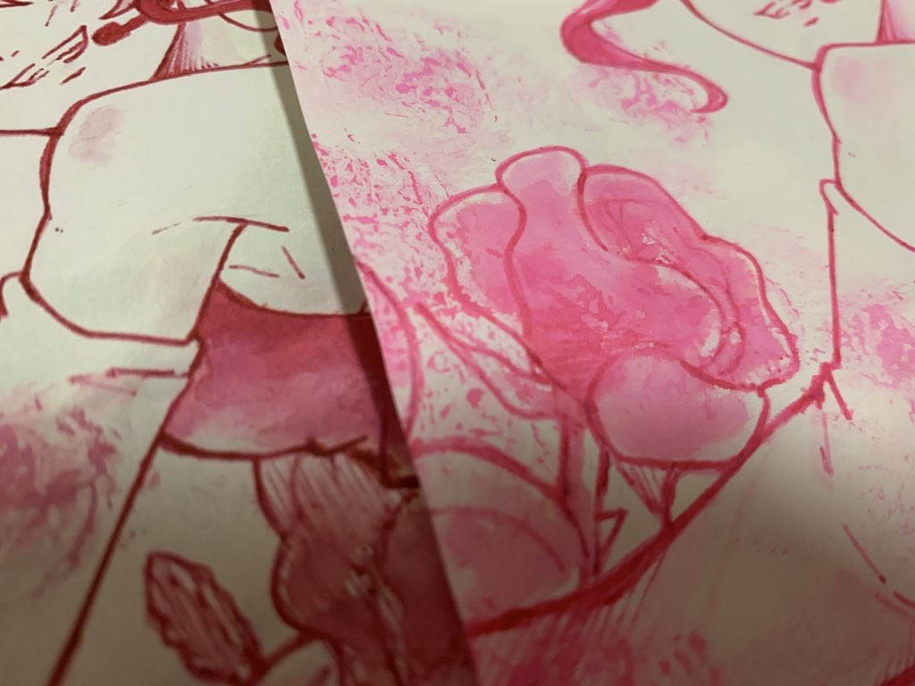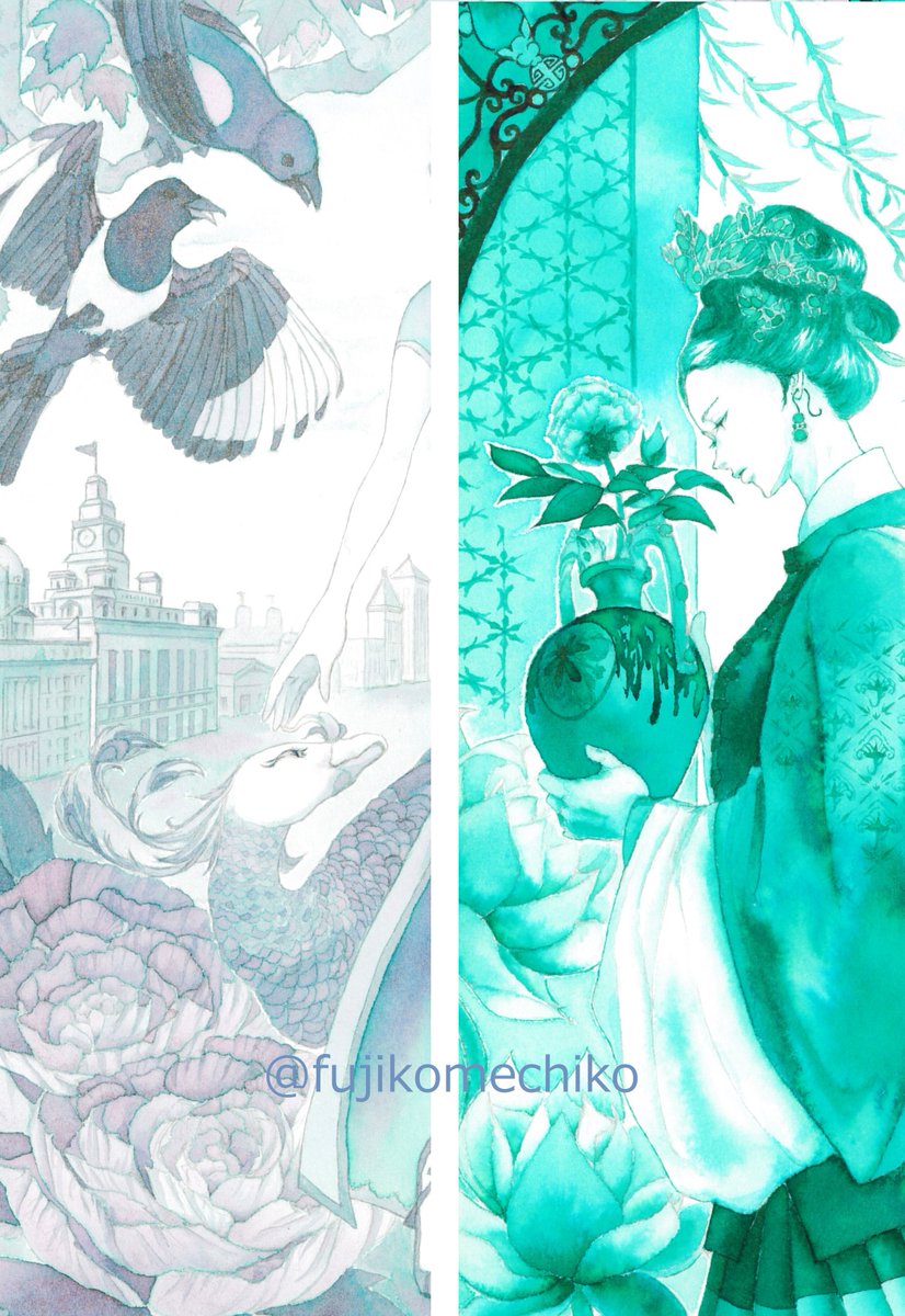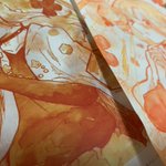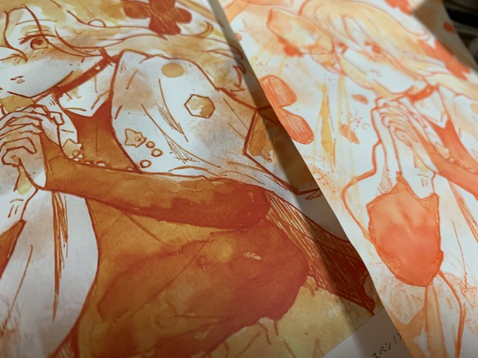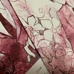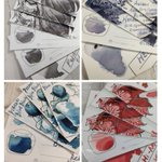 #インク・ミュージアム #インクイラスト合同誌 通販のものも届き始めているようなのでご報告・・・ オノマトペインクのぽろぽろとどきどき、スキャン、加工や印刷の都合で少し暗く写っています。1枚目2枚目の左側が印刷物、右側が原画です 他の4色はそんなに変わってないです!→