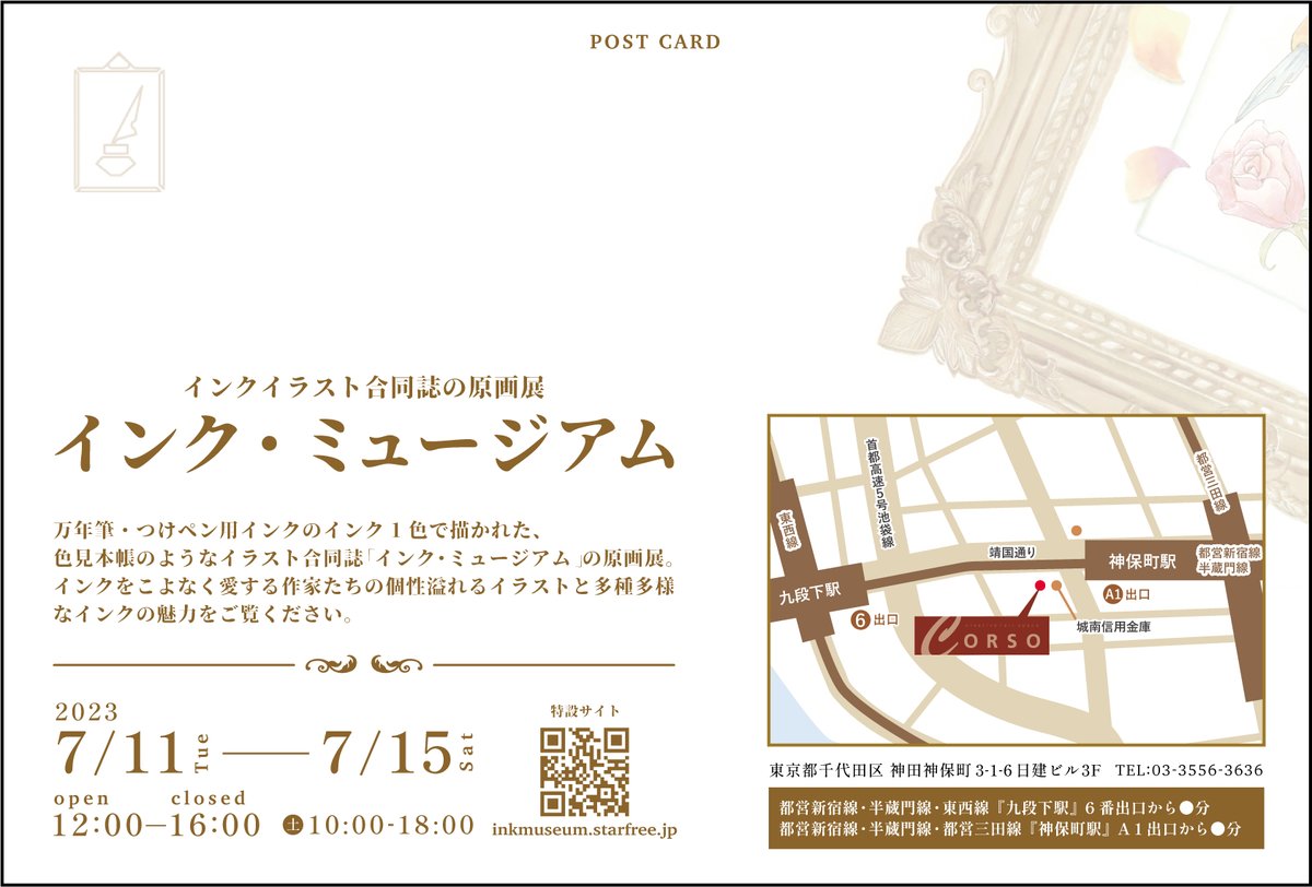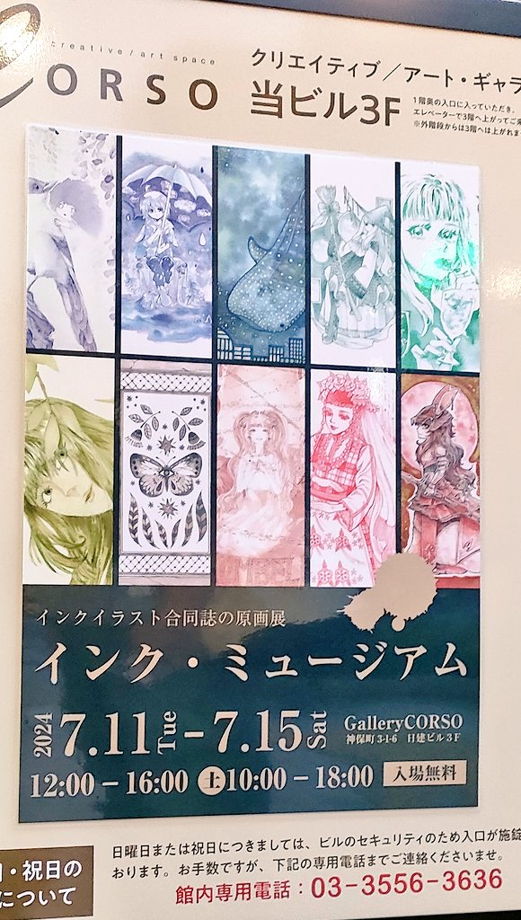 【お知らせ】 大変お待たせいたしました。 #インクイラスト合同誌「#インク・ミュージアム」のグループ展について、情報解禁です! ーーーー 2023年7月11(火)~7月15日(土) 12:00~16:00(最終日のみ10:00~18:00) Gallery CORSO 千代田区神田神保町3丁目1−6 日建神保町ビル3F
