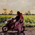 インドネシア滞在中にすれ違った農村の家族風景を描きました。3人乗り。田んぼ道を幸せが走っていきます。 Sweet family going on the way home, villeage road in Indonesia #Watercolor #Indonesia #art #水彩画 #アート #インドネシア