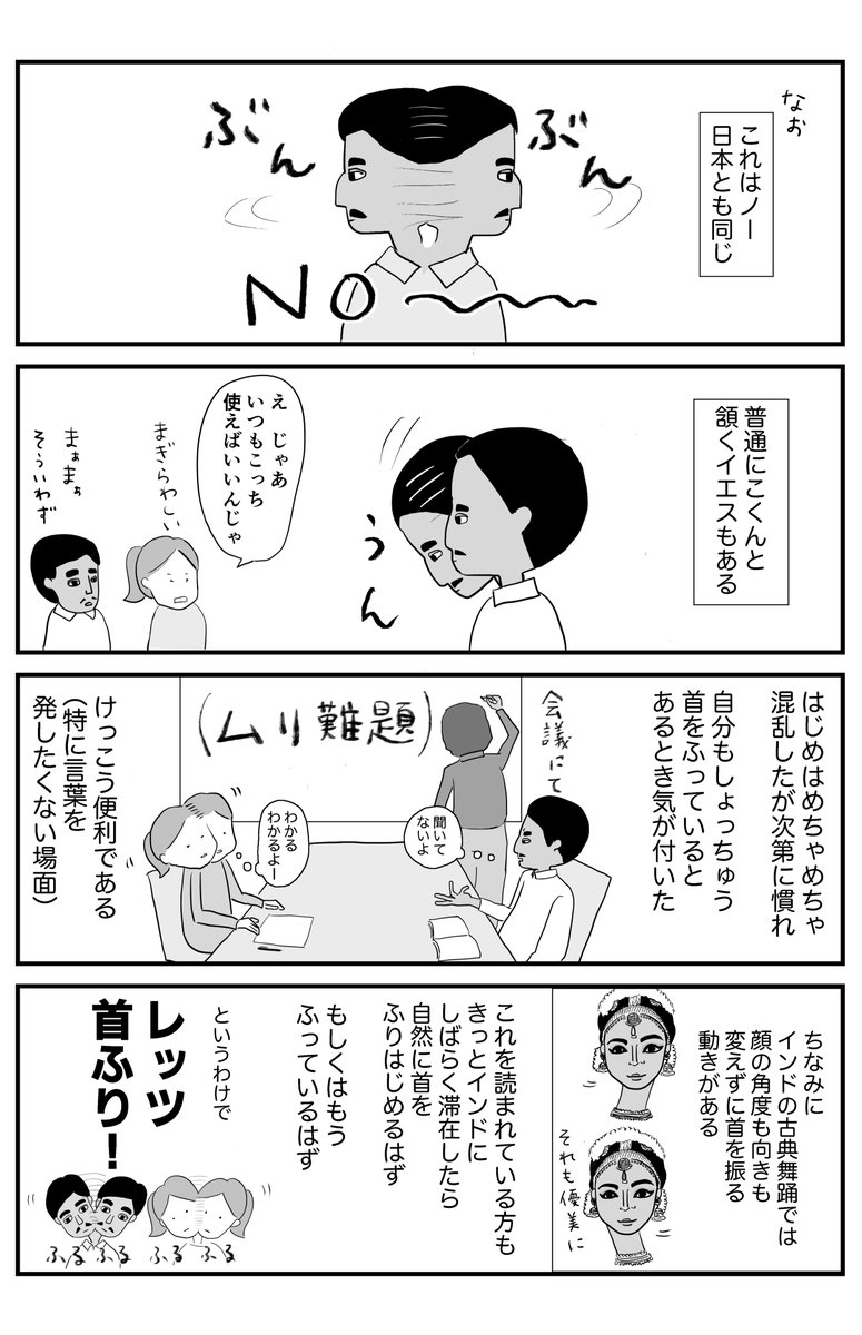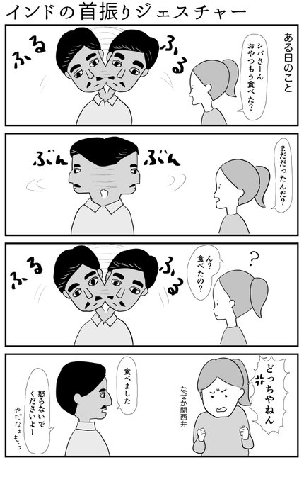 インドの首ふりジェスチャー(3/3) 再掲の1、2もまとめて投稿してます。 みんなでふるふる首を振ってたら、色んな事がどうでも良くなって楽しくなってくるんじゃないかなと思ったり。 #インド #漫画が読めるハッシュタグ