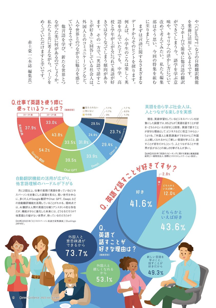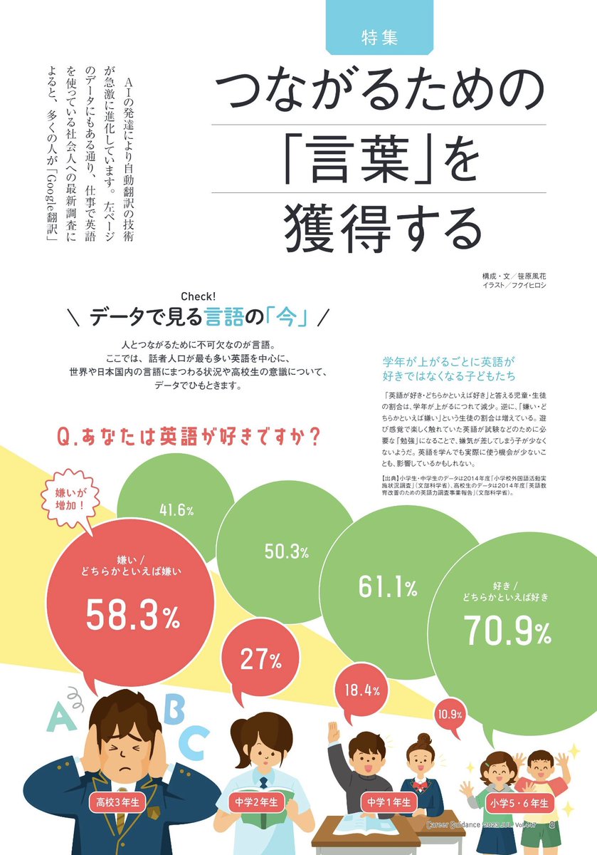 リクルート総研「キャリアガイダンスvol.447」特集記事 #イラスト & #インフォグラフィック 担当しました! Q.あなたは英語が好きですか? 話者の多い英語を中心に世界や日本国内の言語にまつわる状況や高校生の意識についてデータでひもときます。 ☟ PDF・電子ブック souken.shingakunet.com/publication/ca… twitter.com/fukui164/statu…