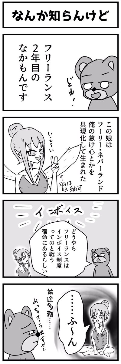 フリーランスなので、インボイス制度とかいう名前しかわからん得体の知れないものと対峙せねばならない 勉強しがてら似たような境遇の人向けに漫画にする🔥 #4コマ漫画 #漫画が読めるハッシュタグ #インボイス制度 #今年度中にインボイス登録申請するフリーランス漫画 1話目