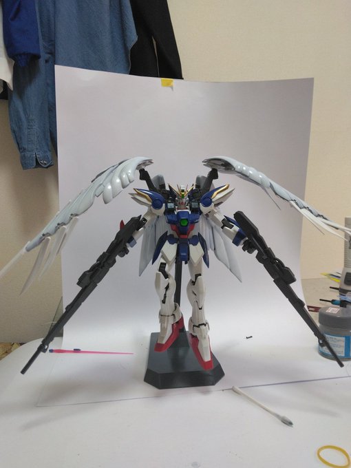 思ったよりデカくて背景の生活感が恥ずかしい子どもこの上ないですが、羽根グラデまで終わりました。(8時間)自立が出来ません!(笑) #ガンプラの画像貼るとRTされると聞いて #ガンプラ好きと繋がりたい #ウイングガンダムゼロカスタム