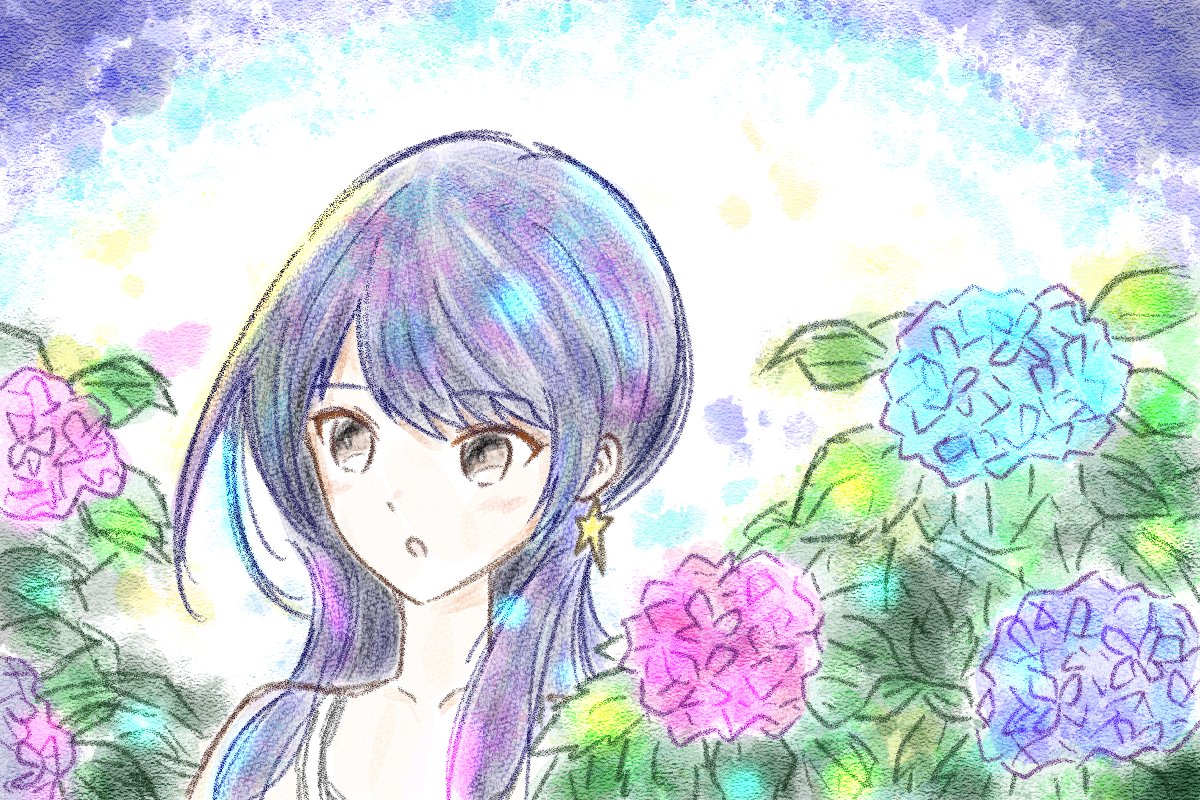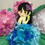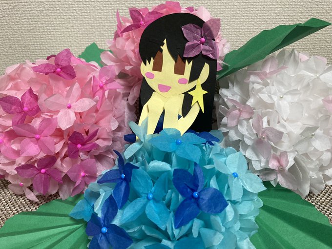ウェザロアートのテーマ「あじさい」💠 内職しているかのように、ひたすら花を作る作業でした(◍´ᯅ `◍) あじさいの妖精?ポン子ちゃん🍋 思ったより大変でしたがかわいく仕上がったと思います😌💙 #ウェザーロイドAiri #ウェザロアート #ウェザーニュースLiVE #あじさい