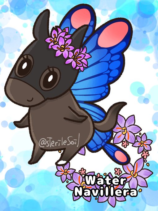 豆大福さん@syokukan156 のご依頼で描いたウォーターナビレラちゃん。 蝶々の意味を持つ名前のイメージで、ということで蝶の羽根付き。 可愛くかけたのでTwitterでもアップさせてもらいました😁 今後も応援しちゃお。 #ウォーターナビレラ