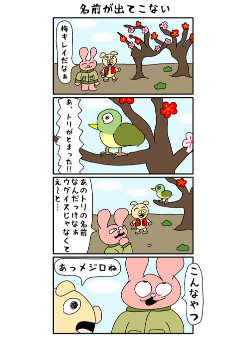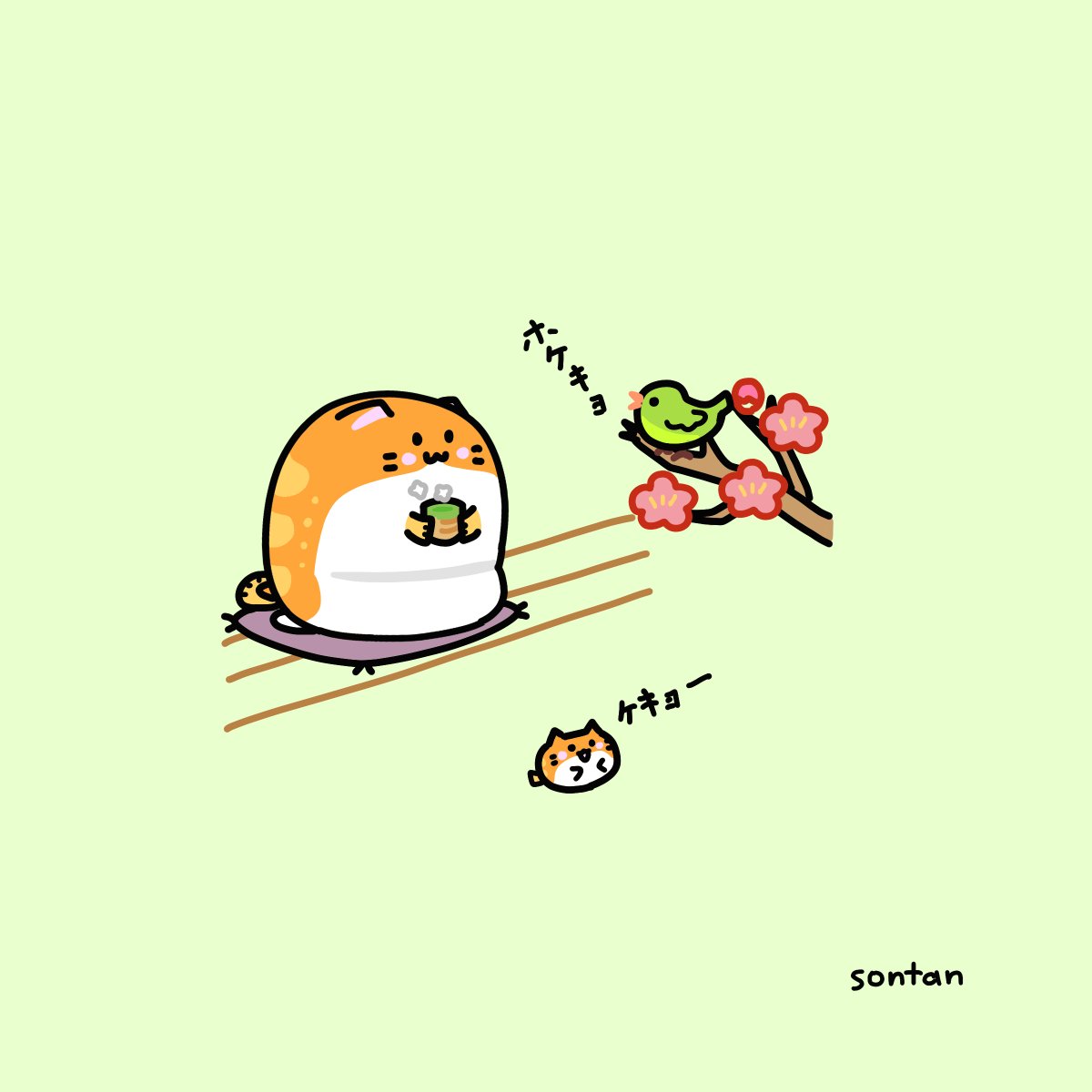 おはばコ~☀️ 最近ちらほらと梅が咲いてるのを見かけるよ🌸 ニンゲンのおばあちゃん、ウメさんちのお庭にも咲いてたんだ! #ウグイスがホーホケキョって鳴くのは春だけなんだって #あおばコ #イラスト #梅 #ウグイス #みんなで楽しむTwitter展覧会 ★お昼におまけ絵があるよ