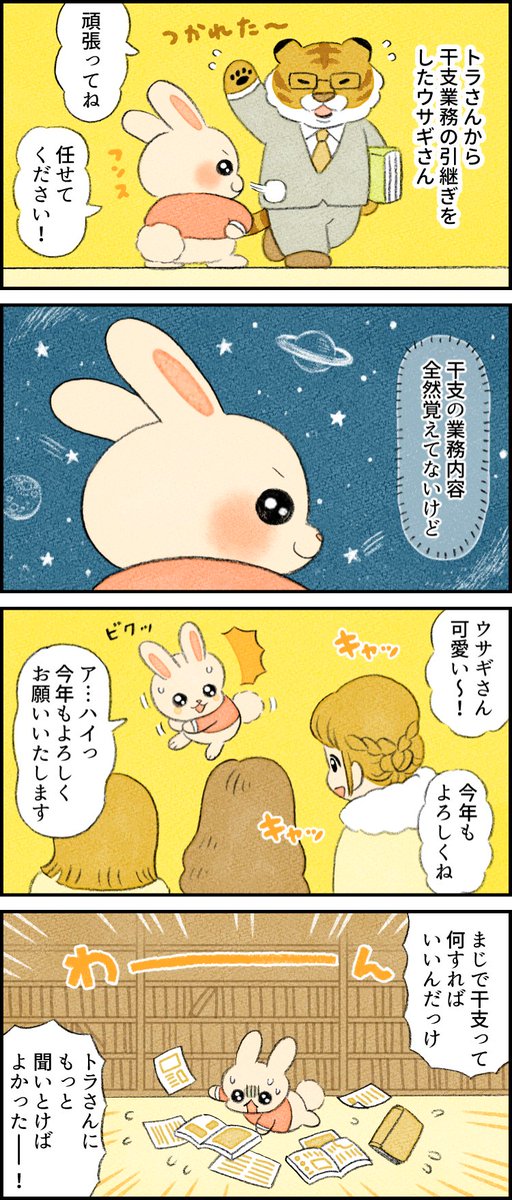 157シュールな干支の引き継ぎ2022 来年うさぎ年も良い年になりますように🐰 #漫画が読めるハッシュタグ #絵描きさんと繋がりたい #みんなで楽しむTwitter展覧会 #漫画 #4コマ漫画 #干支 #寅 #ウサギ #龍 #竜