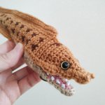 明日から#がまごおり深海魚まつり始まります🐟 ウツボの新色できましたよ。 スレッドの最後に会場のアクセスとブースの位置がわかる地図とイベントのチラシがあります。 #あみぐるみ #amigurumi #crochet #ウツボ #靭 #たけすい