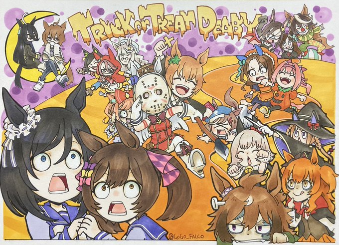 ウマ娘でハロウィンイラスト👻🎃 やっと描けた!! 色紙にアナログで20人はしんどかった!! 一生終わらないかと思った…。 キャラ案出してくださった方ありがとうございます。多分全員入ってます!! #へいアート #スマートファルコン #ウマ娘 #ウマ娘プリティダービー #ウマ娘ファンアート