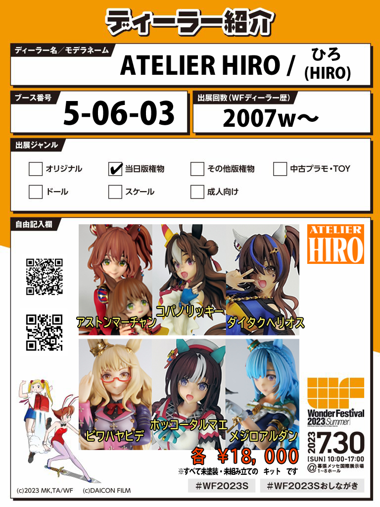 【 おしらせ 】 7月30日開催の ワンダーフェスティバル2023夏に ATELIER HIRO も参加いたします 卓番:5-06-03 新作・再販のウマ娘を連れて参りますので、どうぞよろしくお願いいたします #WF2023Sおしながき #WF2023S #ワンフェス2023夏 #ウマ娘プリティダービー