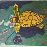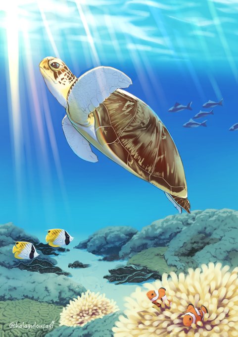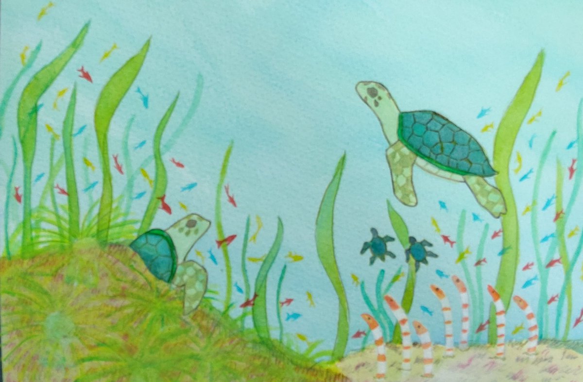 ふぅ・・・なんとか描きあげたぞ・・・。 チンアナゴさん、結構気に入ってます。 このイラストは「どうぶつ展」に出すので、ぜひ遊びに来てくださいね😊 #イラスト好きな人と繋がりたい #イラスト #ウミガメ