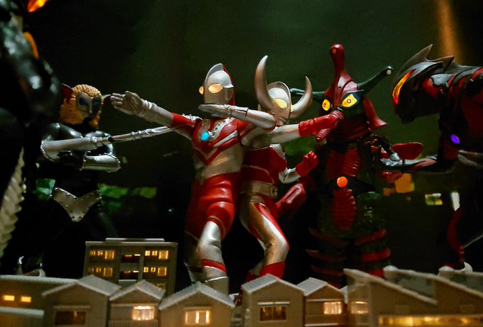 #夜のフィギュア撮影会 お題「心配」(かつての投稿しそびれたお題『子』を兼ねます。過去) いつ訪れるかと心配していた息子、タロウの反抗期が、まさか、よりによって今、この地球で始まるなんて・・・ #ウルトラの父 #ウルトラの母 #ウルトラマンタロウ