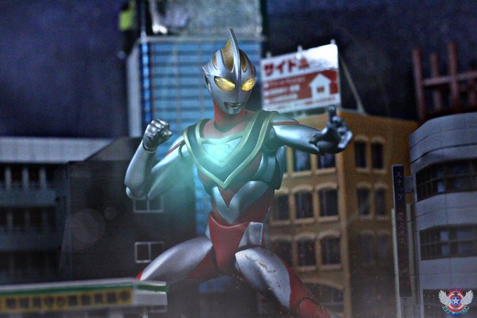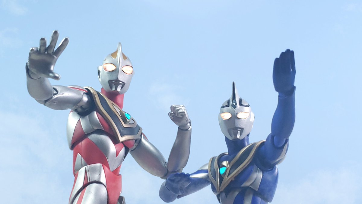 #夜のフィギュア撮影会 テーマ「赤・緑・青」 "大地の赤い光の巨人" と "海の青い光の巨人" #ウルトラマン #ウルトラマンガイア #ウルトラマンアグル #特撮 #ウルトラアーツ #ちいさな巨大特撮 #フィギュアーツ写真部 #フィギュア撮影友の会