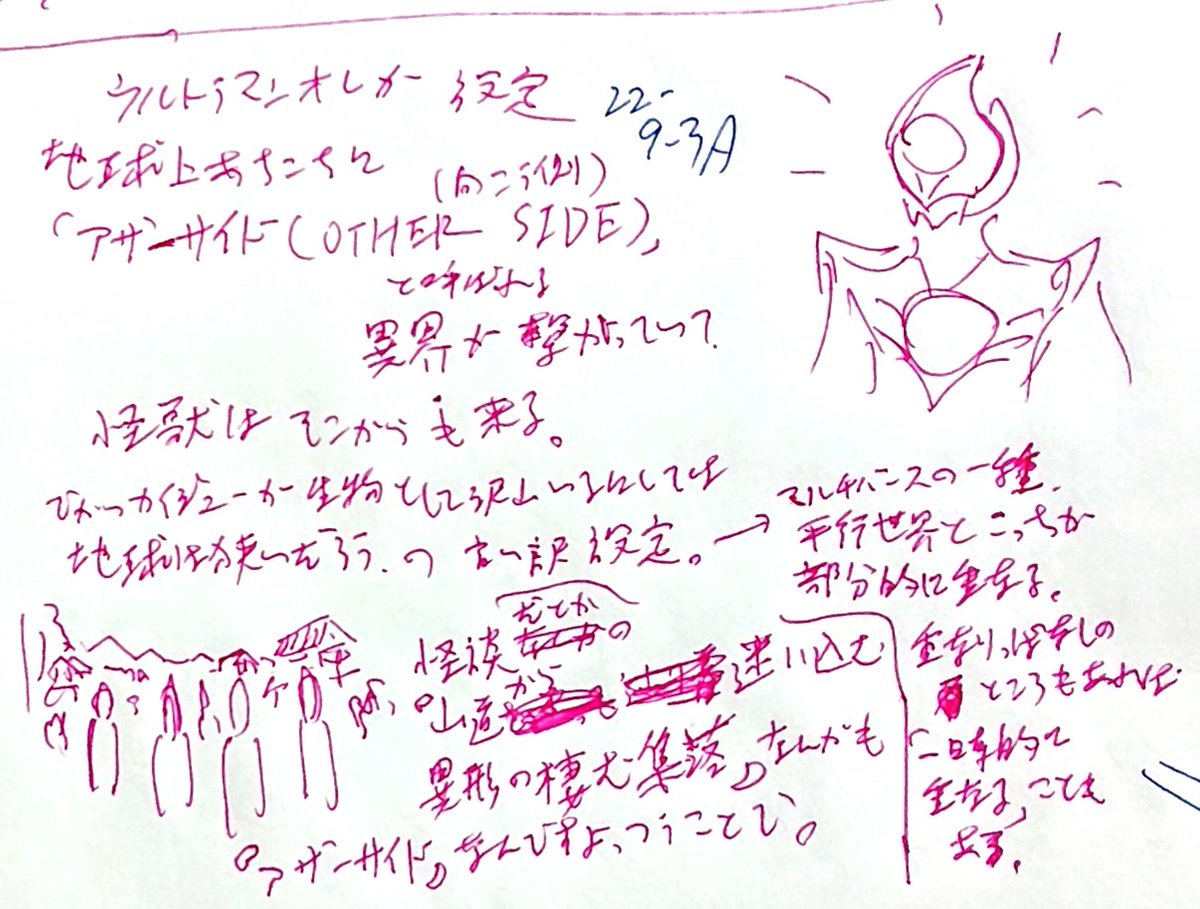 #オリトラマン 『#ウルトラマンオレガ』設定メモ。 地球上あちこちに 『アザーサイド(OtherSide/向こう側)』 と呼ばれる異界が繋がっていて、 怪獣は そこから"も"来る。 『でかい怪獣が 生物として沢山いるにしては 地球は狭いだろう』問題への 言い訳設定。 (続く)