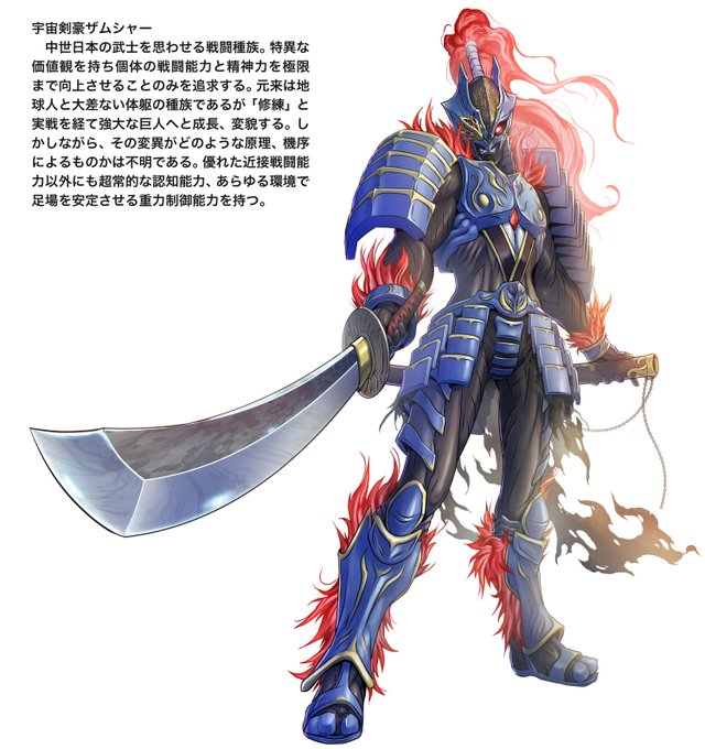 宇宙剣豪ザムシャー 鎧を装備したというよりそういう形の生物に変貌した存在として描いてみました。厨二な設定も付加、眼帯はやっぱナニカを封じているのですよ。 ※設定は独自にアレンジ、一部捏造したもので公式ではありませんw #ウルトラマンメビウス #Reウルトラ