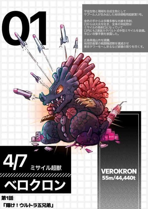 ベロクロン50周年だよ。 平成になって出てきたベロクロンとの見た目の違いは、手の爪だけが金色だよ鼻とか足の爪はネイルしてないよ!って感じです。 第一話のモンスターとしては各シリーズでもなかなかのインパクトがあるんじゃないかと思います。 #ウルトラマンA50周年