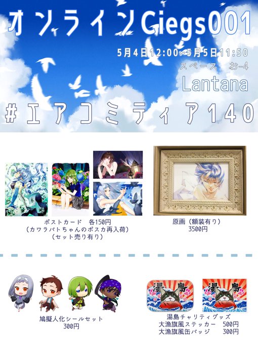 今日5月4日の #オンラインCiegs001 と明日5月5日の #エアコミティア140 のお品書きです! 創作イラストとか鳩の擬人化やってます🕊 オンラインCiegs001▶︎ pictsquare.net/pqikbv35q9kq0e… Booth▶︎ 810-t.booth.pm よろしくお願いしますー! #エアコミティア_通販 #エアコミティア_イラスト