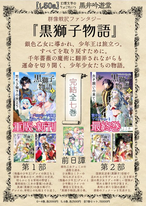 少年王たちの奪還と復讐には、薔薇の魔法が絡み付く。運命を遂げる群像戦記ファンタジー。 『黒獅子物語』全7巻。 時代に左右されぬ本物の王道。 幻想文学の真髄を、読書家のあなたに。 961cocoanna.booth.pm #COMITIA139 #エアコミティア139 #エアコミティア_文芸 #エアコミティア_通販 twitter.com/961_cocoanna/s…