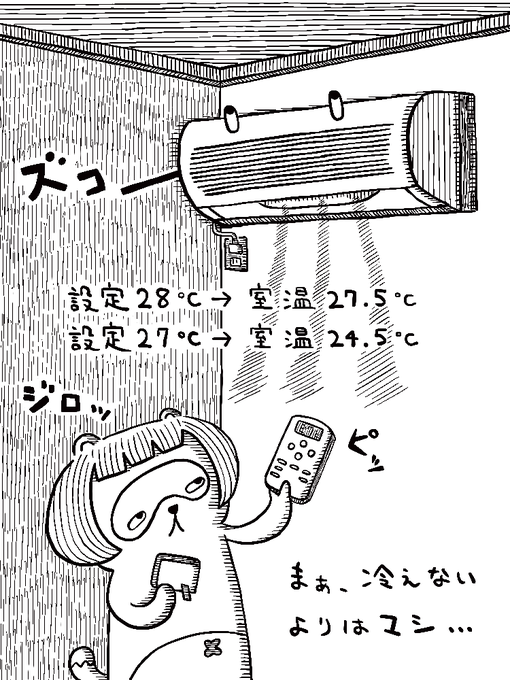 【どうした!?へまへまさん】012 台風後、急に涼しくなって、慌てて長袖出したけど そう簡単にすんなり涼しくならないのが、にゃごやの夏でございます 本日の最高気温、31℃ #うさぎ #ウサギ #残暑 #エアコン #イラスト #イラストレーション #1コマ漫画 #絵本 #絵 #illustration #illustrator