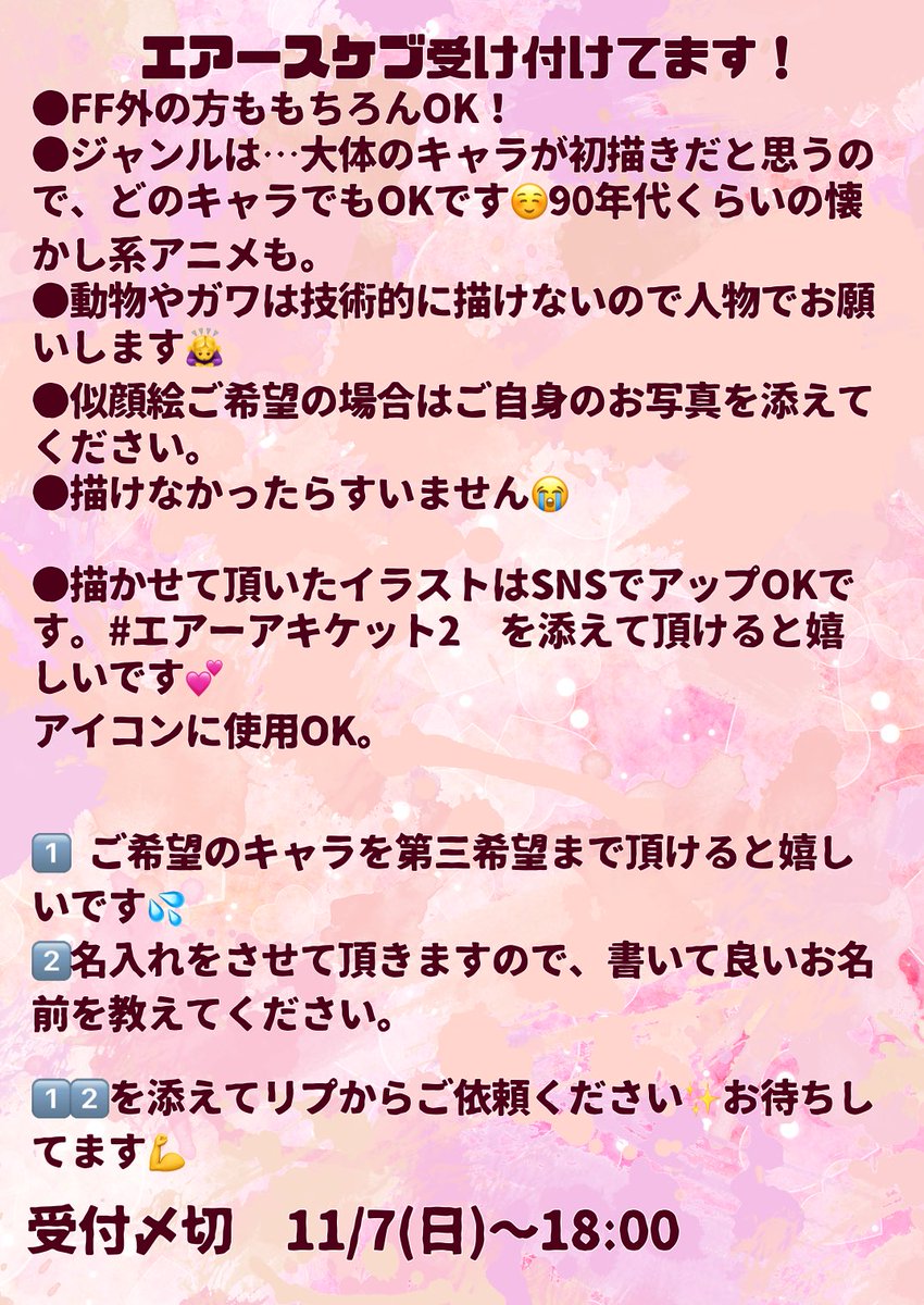 #エアーアキケット3 に参加させて頂きます😊すっかりエアスケブサークル😅今回は事前リクエスト受け付けてます。土日にせっせと描かせて頂きますので是非リクエストください✨似顔絵から懐かし系ものまで大丈夫です(多分💦)。クオリティは期待しないでね😅 画像は過去に描かせて頂いたエアスケブ達✏️ twitter.com/akiketto/statu…