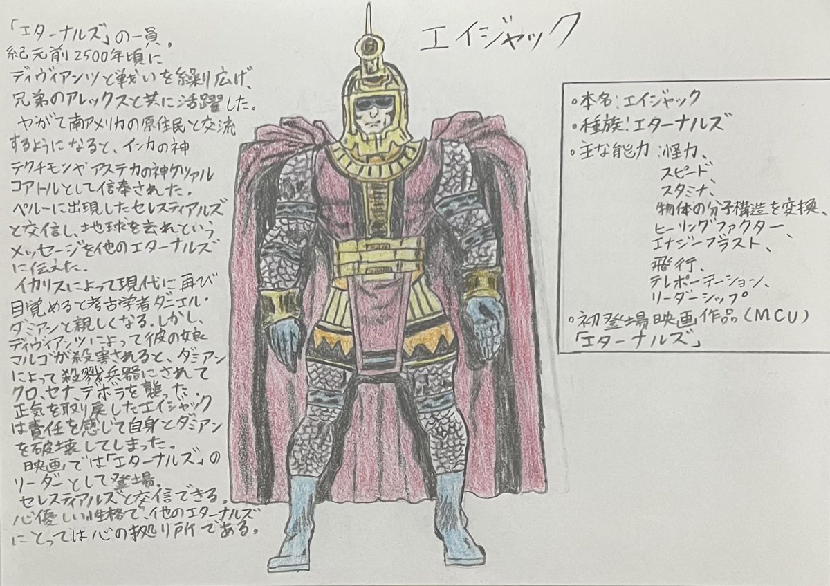 手描きMCUヒーロー列伝エイジャック ・本名:エイジャック ・種族:エターナルズ ・能力:ヒーリングファクター、統率力 ・初登場映画作品(MCU) 『エターナルズ』 #marvel #エターナルズ #エイジャック #絵描きさんと繋がりたい #映画好きと繋がりたい #芸術同盟 #みんなで楽しむTwitter展覧会