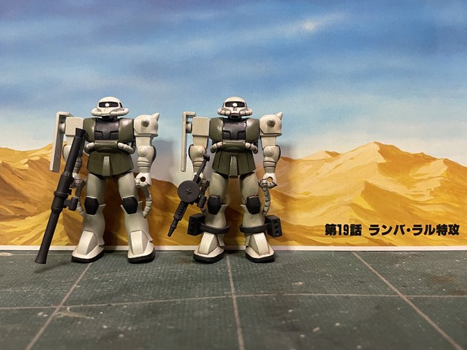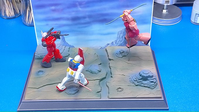#ガンダム情景模型 完成😁 ぴゅぴゅ~~ん 第37話 テキサスの攻防 エアブラシと筆とで全塗装 アップ写真には…😂 自分の腕ではこんなもんでしょう 作ってて思ったジオラマ面白いな #エイトフォールド #旧キット #ガンプラの画像貼るとRTされると聞いて #ガンプラ好きと繋がりたい #ジオラマ