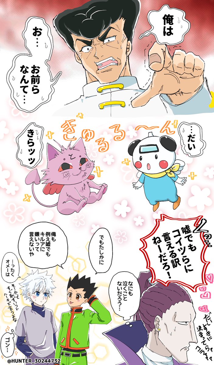 エイプリルフール大遅刻💨 お題 「ポットクリンとトリタテンに大嫌いと嘘をつくナックル」 嘘でもそんなこと言えないナックル素直優しピュア可愛い…😌🙏✨ そしてさりげなくイチャつくゴンキルも可愛い…😌💕 タップ推奨 #hxh #hxhfanart #ゴンキルナッシュ #エイプリルフール2023