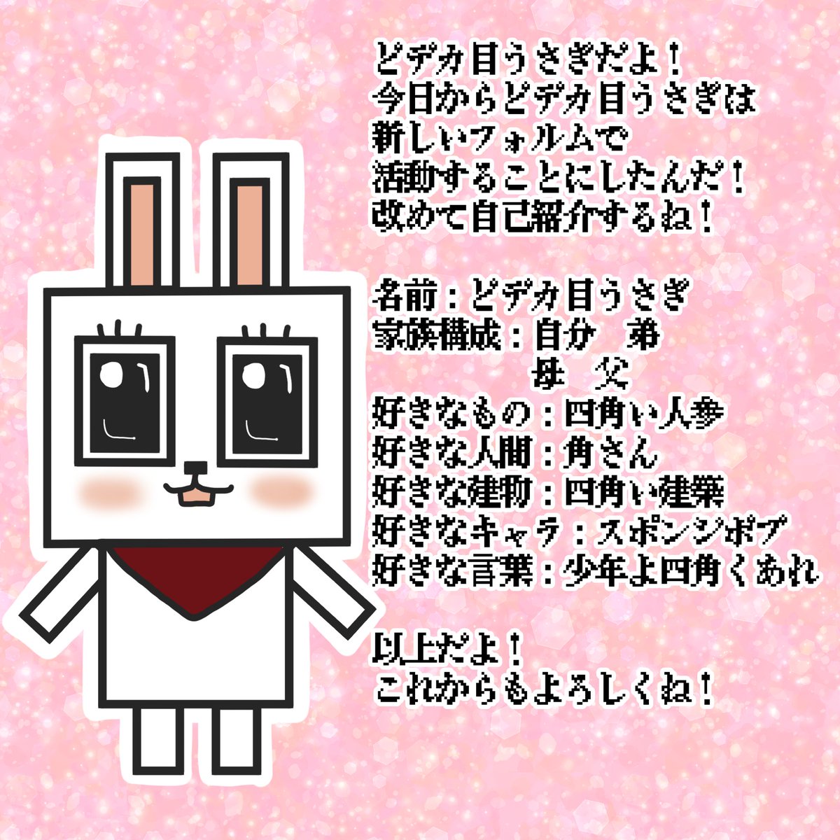 おはようございます🌸 今日から4月! どデカ目うさぎは新たな気持ちで頑張っていこうと思います‼️これからの時代は丸じゃなくて四角! 応援よろしくお願いします✨ #イラスト #どデカ目うさぎ #イラスト好きさんと繋がりたい #illustration #みんなで楽しむTwitter展覧会 #エイプリル・フール