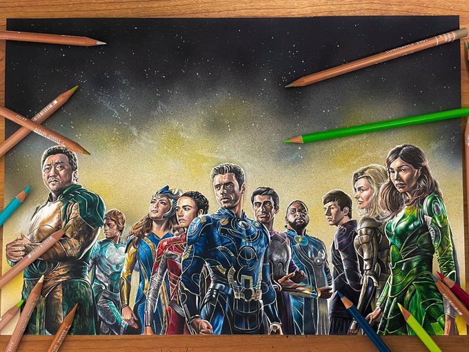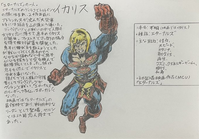 手描きMCUヒーロー列伝イカリス ・本名:不明(イカリス) ・種族:エターナルズ ・能力:怪力、飛行、コズミックエネルギービーム ・初登場映画作品(MCU) 『エターナルズ』 #marvel #絵 #エターナルズ #イカリス #絵描きさんと繋がりたい #映画好きと繋がりたい #芸術同盟 #みんなで楽しむTwitter展覧会
