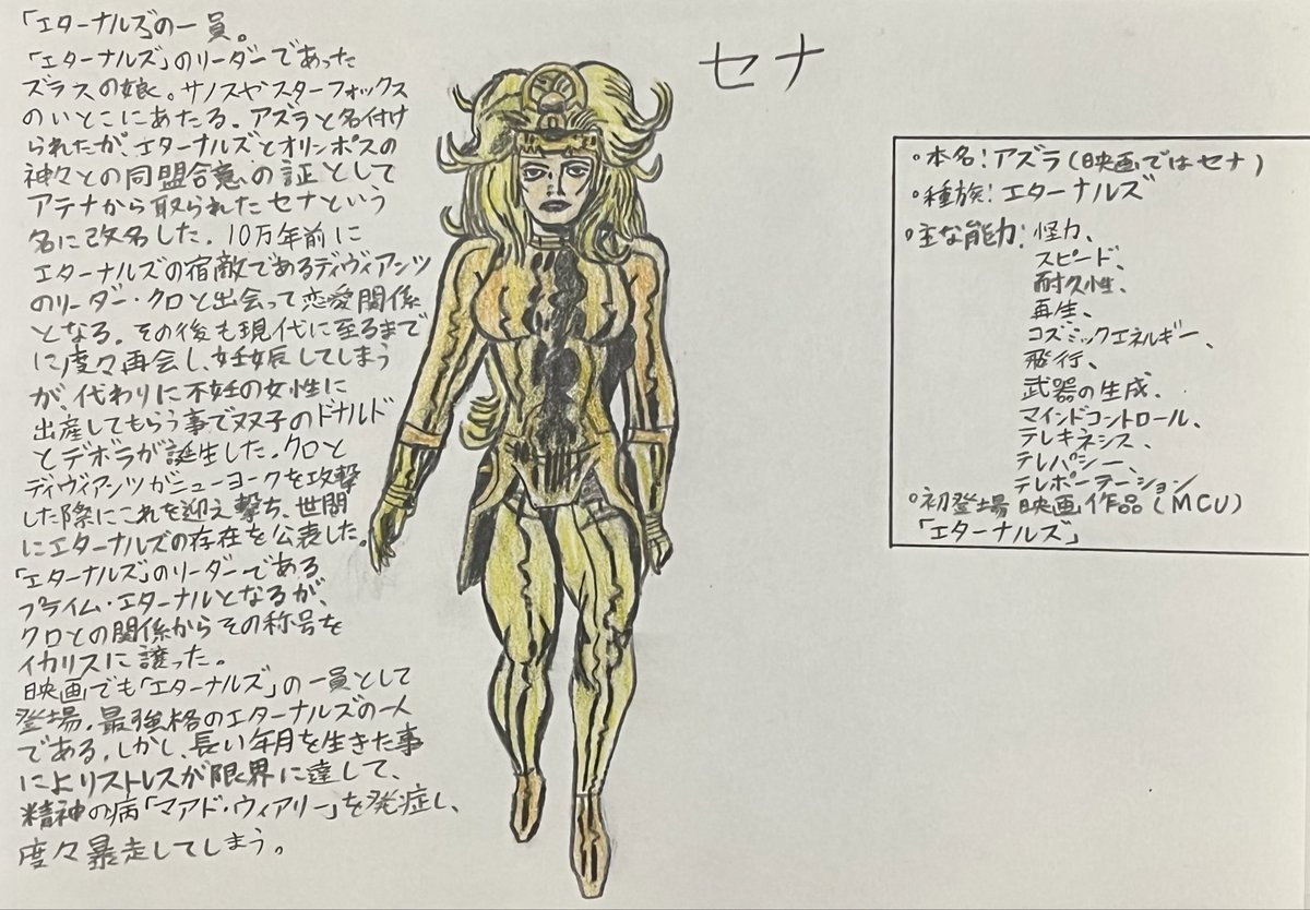 手描きMCUヒーロー列伝セナ ・本名:アズラ(セナ) ・種族:エターナルズ ・能力:怪力、コズミックエネルギー、武器の生成 ・初登場映画作品(MCU) 『エターナルズ』 #marvel #エターナルズ #セナ #thena #絵描きさんと繋がりたい #映画好きと繋がりたい #芸術同盟 #みんなで楽しむTwitter展覧会