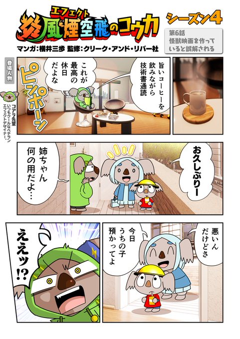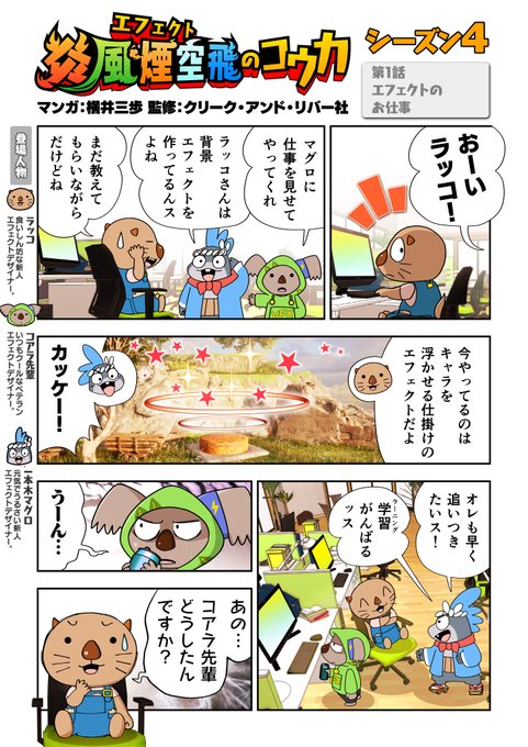 『炎風煙空飛のコウカ』4章 第1話 エフェクト制作で一番大事なことは皆さんなんだと思いますか? ヒント:コアラ「エフェクトは遊ぶ人の気持ちを想像して作ろうな!」 (もちろん正解は諸説あります) #VFX #横井三歩 #エフェクト #炎風煙空飛のコウカ #VFXSTUDIO #漫画が読めるハッシュタグ