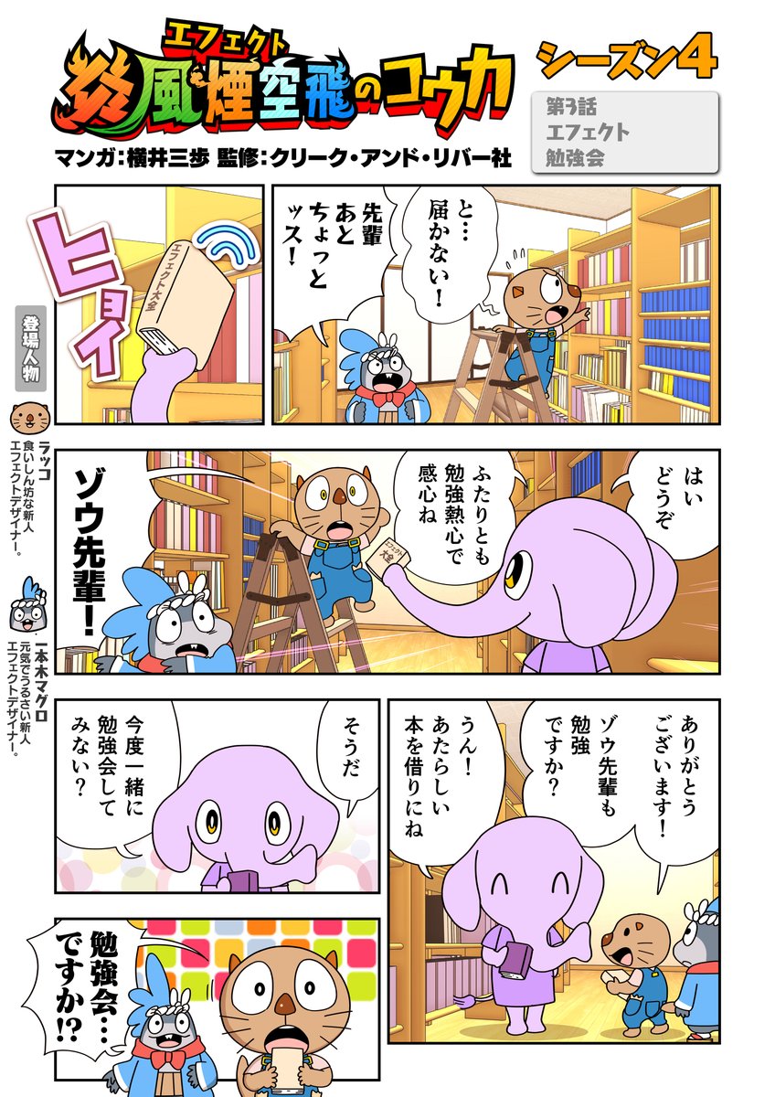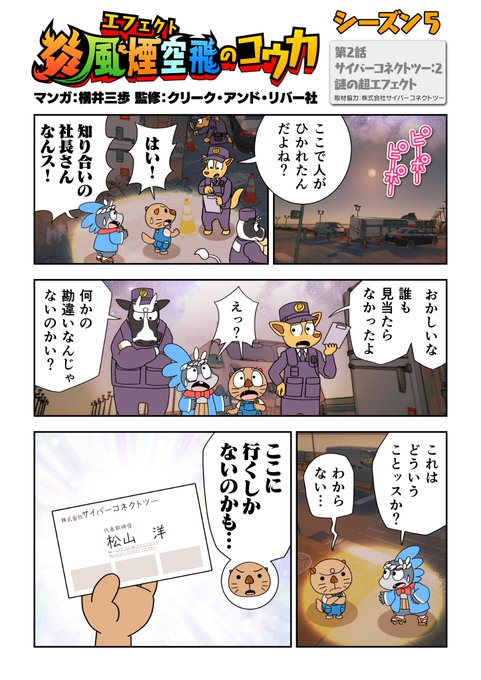 『炎風煙空飛のコウカ』5章 第2話 福岡本社へ訪れたラッコたち。(よく見るとフーガのポスターも…👀) ハイクオリティの秘訣をあれこれお聞きしちゃいます‼ #VFX #横井三歩 #エフェクト #炎風煙空飛のコウカ #VFXSTUDIO #漫画が読めるハッシュタグ #サイバーコネクトツー