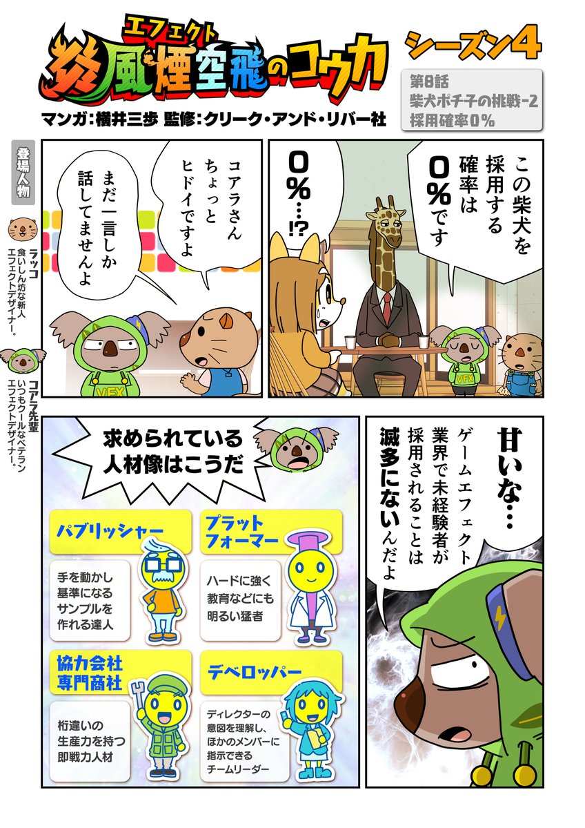 『炎風煙空飛のコウカ』4章 第8話 採用確率0%!…の理由とは? 現場ではそれぞれどんな人が求められているかの理解が必要です✍ そしてポチ子はチャンスを掴めるのか!? #ゲーム #VFX #横井三歩 #エフェクト #炎風煙空飛のコウカ #VFXSTUDIO #漫画が読めるハッシュタグ