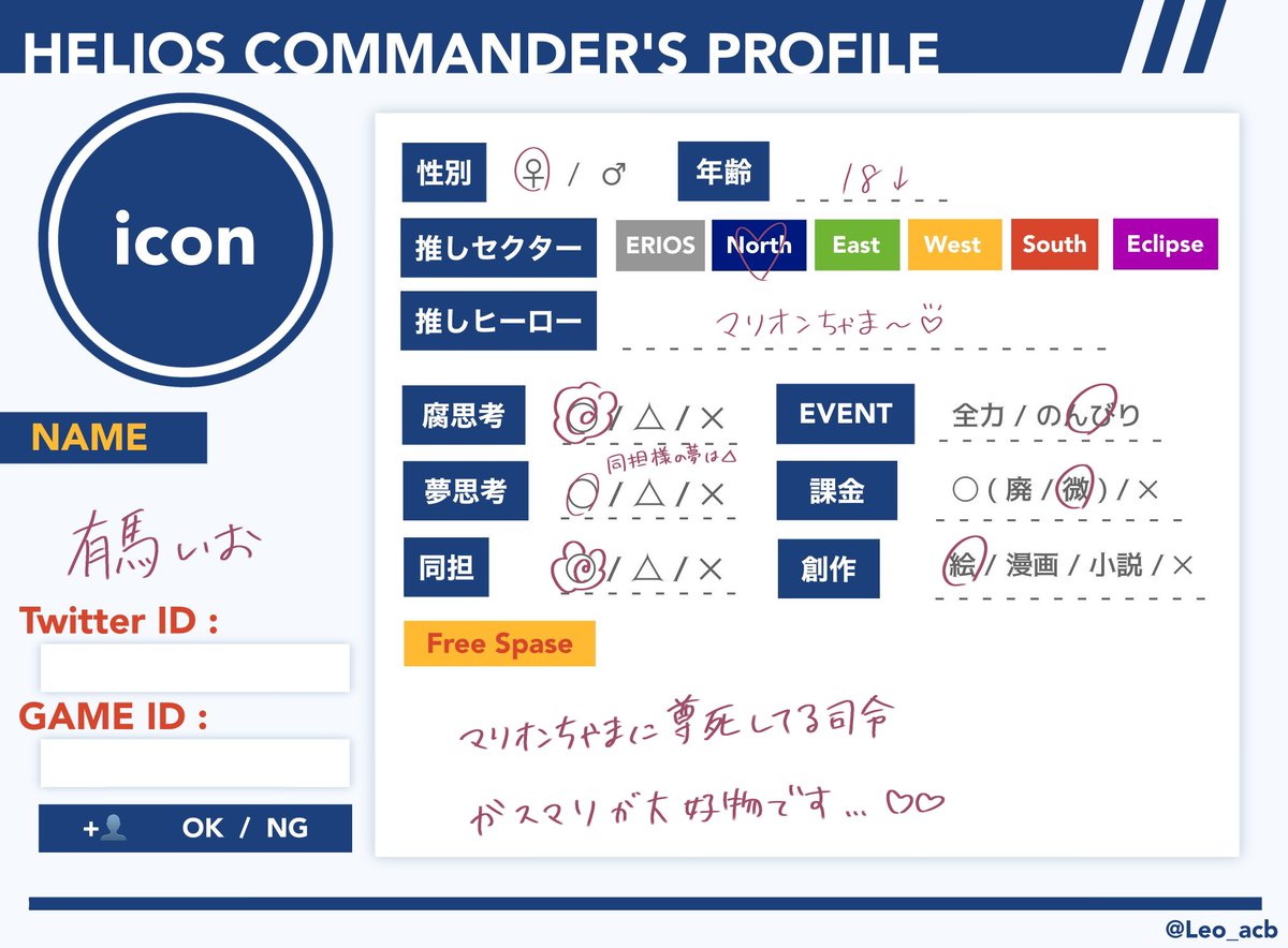 #エリオスR好きさんと繋がりたい #エリオスR絵描きさんと繋がりたい 1.5周年前の空気に乗っかって! 🌹中心にノースに狂い気の向くままに絵を描くオタクです!(腐女子思考有) 沢山お話出来たら嬉しいです!よろしくお願いします✨ プロフカード↓一読お願いします profcard.info/u/TOEQX5ubH3dX…