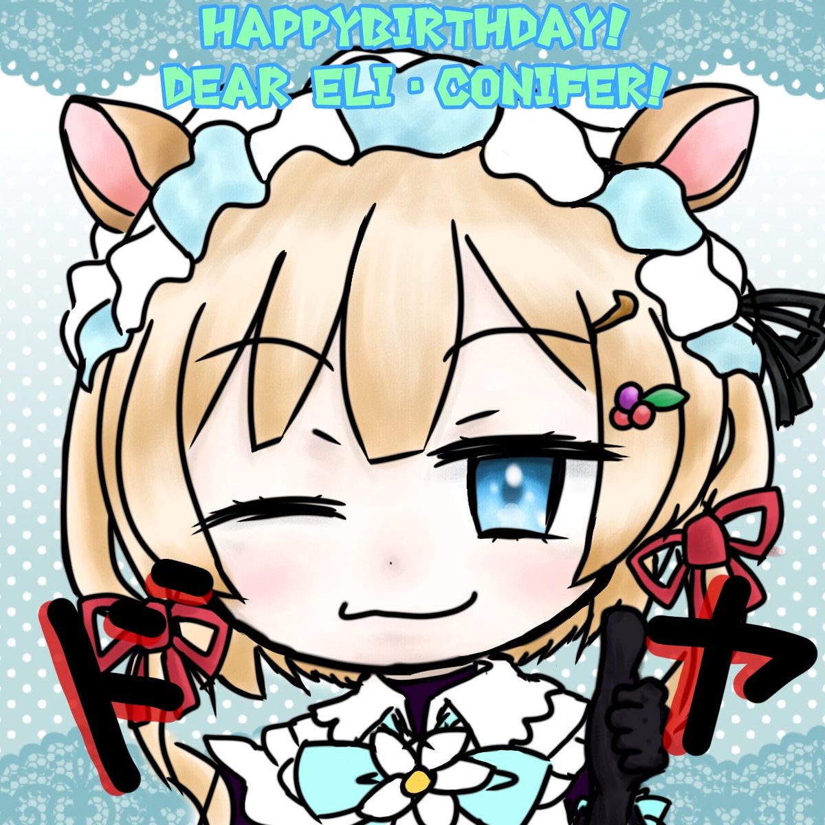 エリーお誕生日おめでとう!! 音ゲーの世界、リハビリ、メイド棟のお引越しに作業など大忙しな中でいつも癒しをくれてありがとう! ずっと大好きです!!!!これからも沢山応援させてください!!!!!!!! #エリコニBD #絵にふぁー #エリー・コニファー